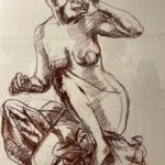 Lazzari further explores this loss of stability in a remarkable animated video that brings her drawings to life, accumulating stroke by stroke as the image reappears and then disappears. The figures literally move as they sink, twist and fall through space. The accompanying soundtrack provides emotional clues to interior thoughts and feelings. The sound of ragged breaths with long pauses suddenly punctuated by loud gasps is powerful, suggesting attempts to control panic with yogic breathing and failing time and again. Images are erased, then redrawn as the bodies tumble from the upper left towards the bottom like the man who fell from earth. But then, magically, colors appear intermittingly shifting from achromatic to color. Images of the iconic Venus De Milo pop up reminding us that she too was found missing parts of her anatomy, though deemed beautiful anyway. The soundtrack turns upbeat and inventive, channeling early radio sound effects that complement the fragmentary flashing imagery. A subliminal image of the artist herself in a blue bathing suit briefly appears and the video which starts in panicky imagery ends on a hopeful note of hard- won recovery.