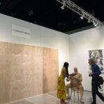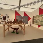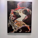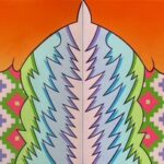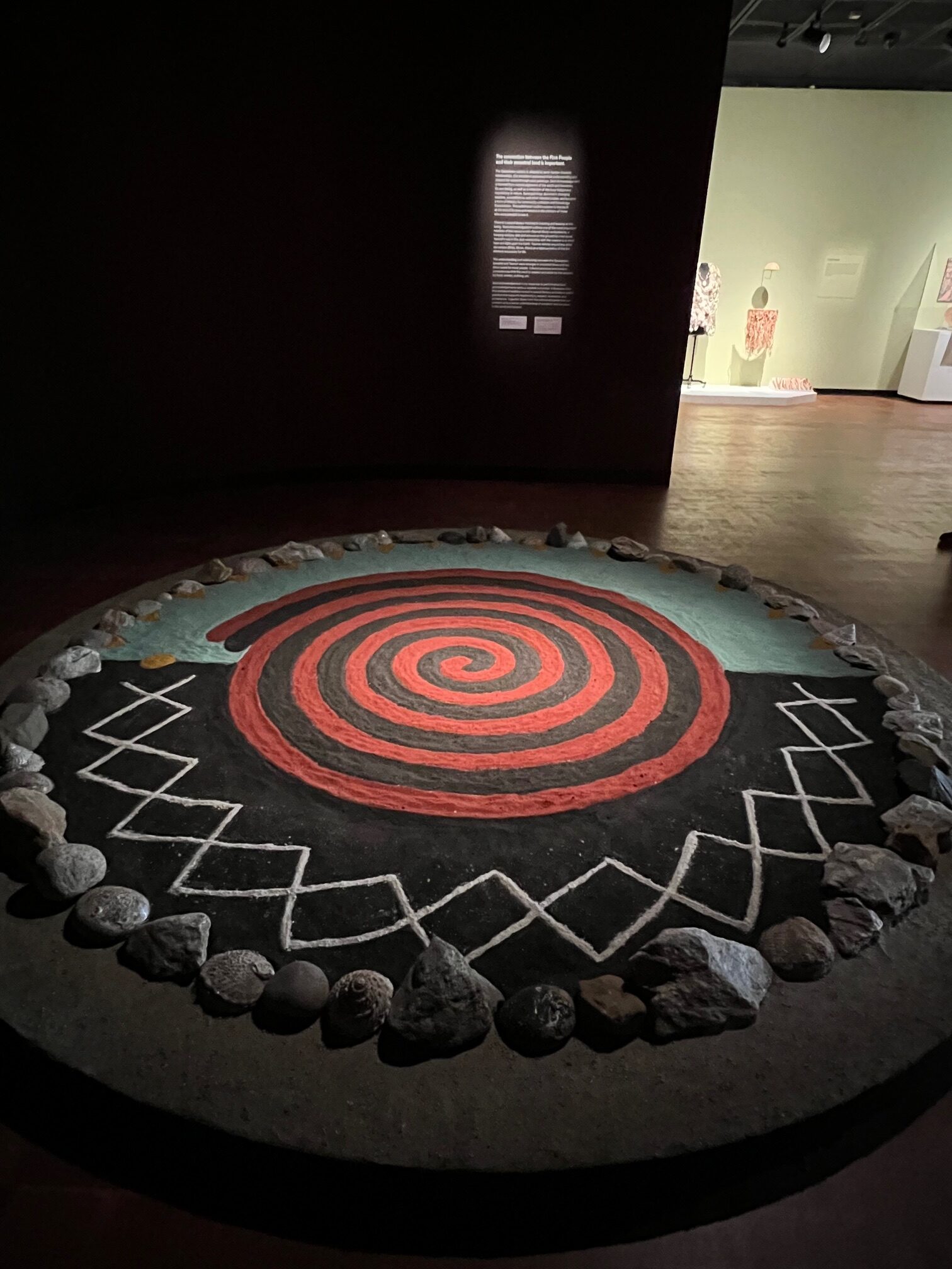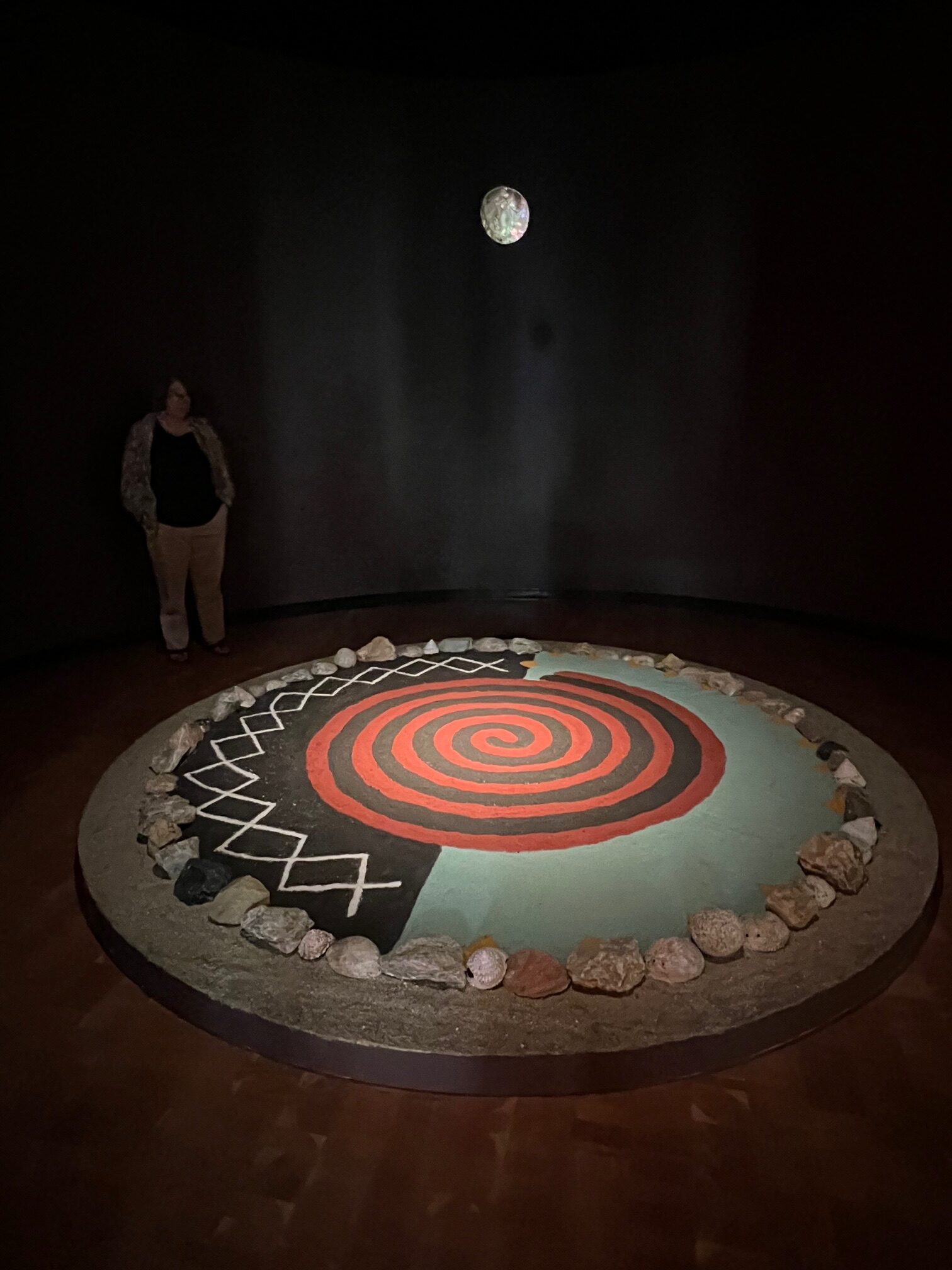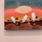 Another highlight is the instalaltion “Sand Acknowledgment” by Lazaro Arvizu (Gabrieleno/Nahua) that reflects traditional and ephemeral sand-painting practices. Arvizu illustrates the connections between the land, humans, the sun, the stars, and animals. Like the installaton of Fragua’s poppies, this work too will return to the earth at the end of the exhibition.