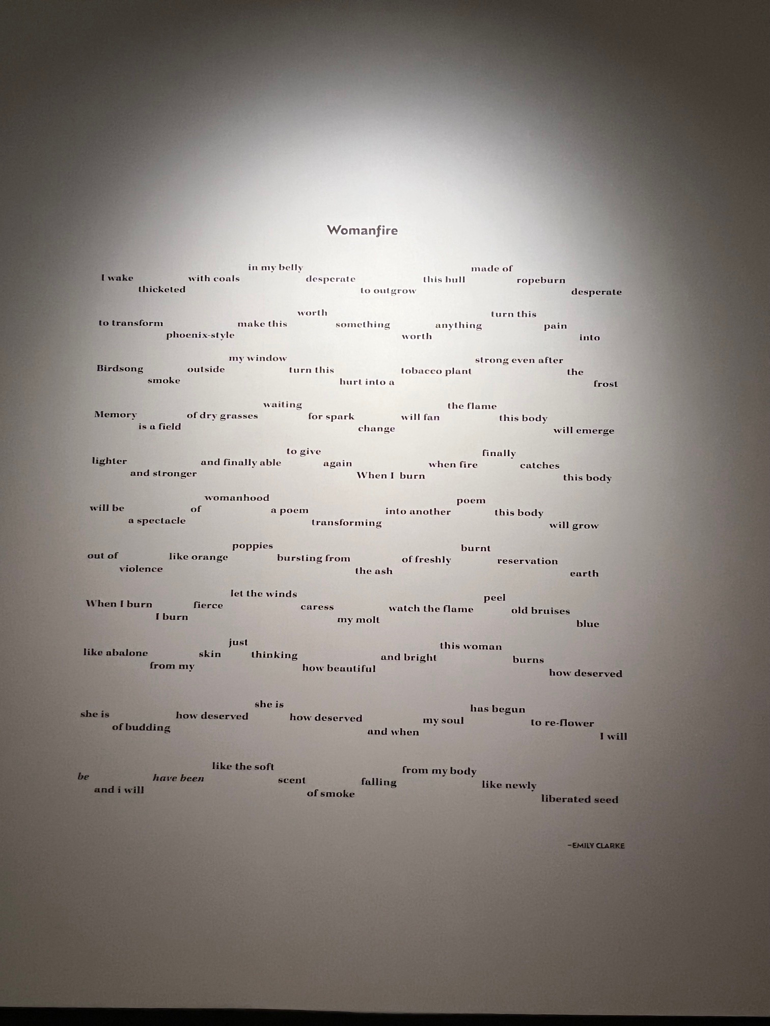 Alvitre’s portraits face a wall installation of a new work from poet Emily Clarke (Cahuilla Band of Indians), Womanfire. The poetry is moving and rich, written in electrocardiogram-esque lines that imitate a Cahuilla basket pattern believed to represent the mountains and valleys in Cahuilla homelands. The gloriously strong writing reflects on the fact that Native women are disproportionately at risk of experiencing violence. She intertwines this fact with another: their survival of abuse and trauma can be compared to a cultural burning, one which encourages renewal, regrowth, and abundance.