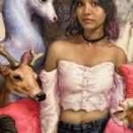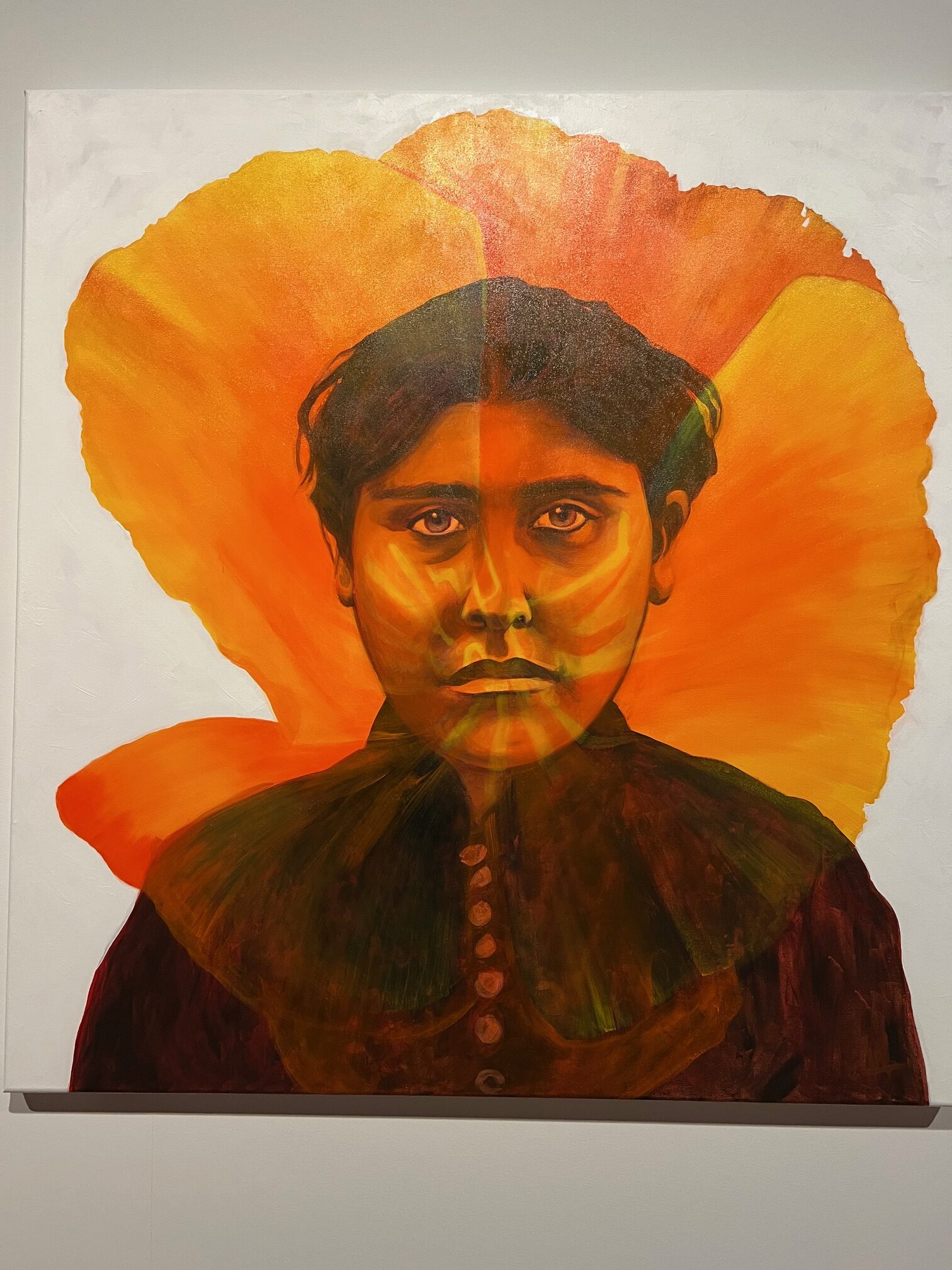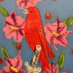 Weshoyot Alvitre creates a poppy-splashed portrait series exploring the multilayered histories of several women from her tribal community who fought for their people’s rights: Narcissa Rosemeye, a Tongva language keeper; Modesta Avila, who protested the development of the Santa Fe Railroad on her family’s land and became the first convicted felon in the state of California; Espiritu Leonis, who protected her ancestral homelands by using the United States legal system in a 15-year case. The portraits are powerful, evocative, and beautifully alive, apt tributes to brave and resourceful Native women.