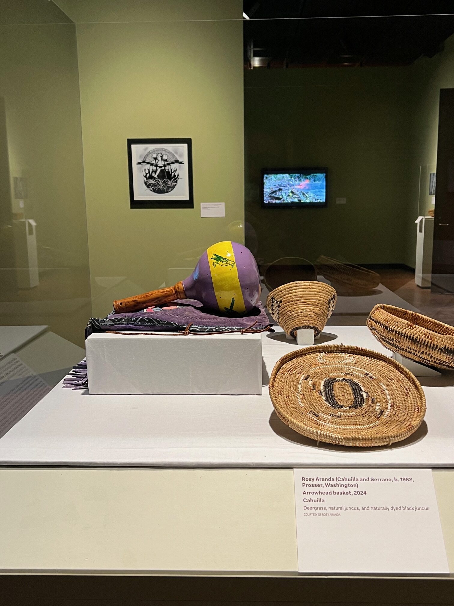 Also poetic is a multimedia installation, “The Heart is Fire.” The installation includes video, birdsong audio, and natural materials and was created by Gerald Clarke Jr. (Cahuilla Band of Indians). The piece is inspired by the Cahuilla creation story, a book about the Cahuilla by Deborarh Dozier, and traditional uses of fire. It also introduces and reflects upon the use of contemporary burns during all-night funerary ceremonies and bird-singing events within Cahuilla communities.