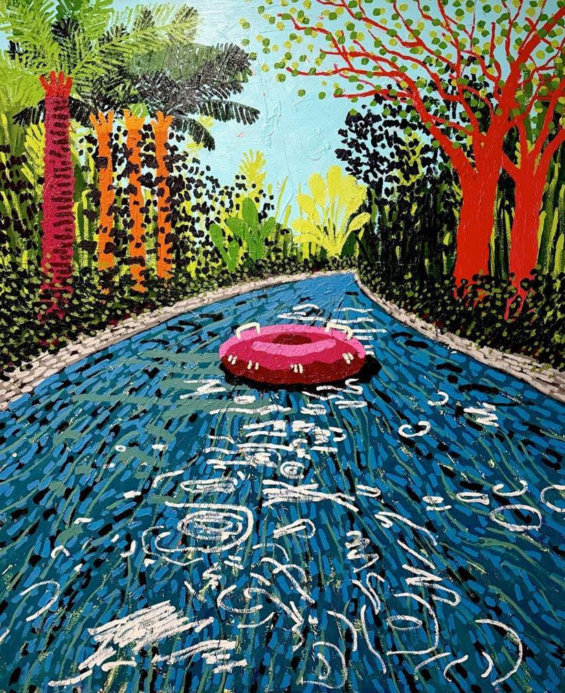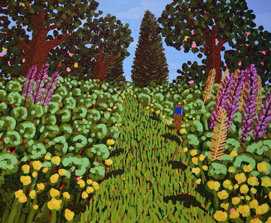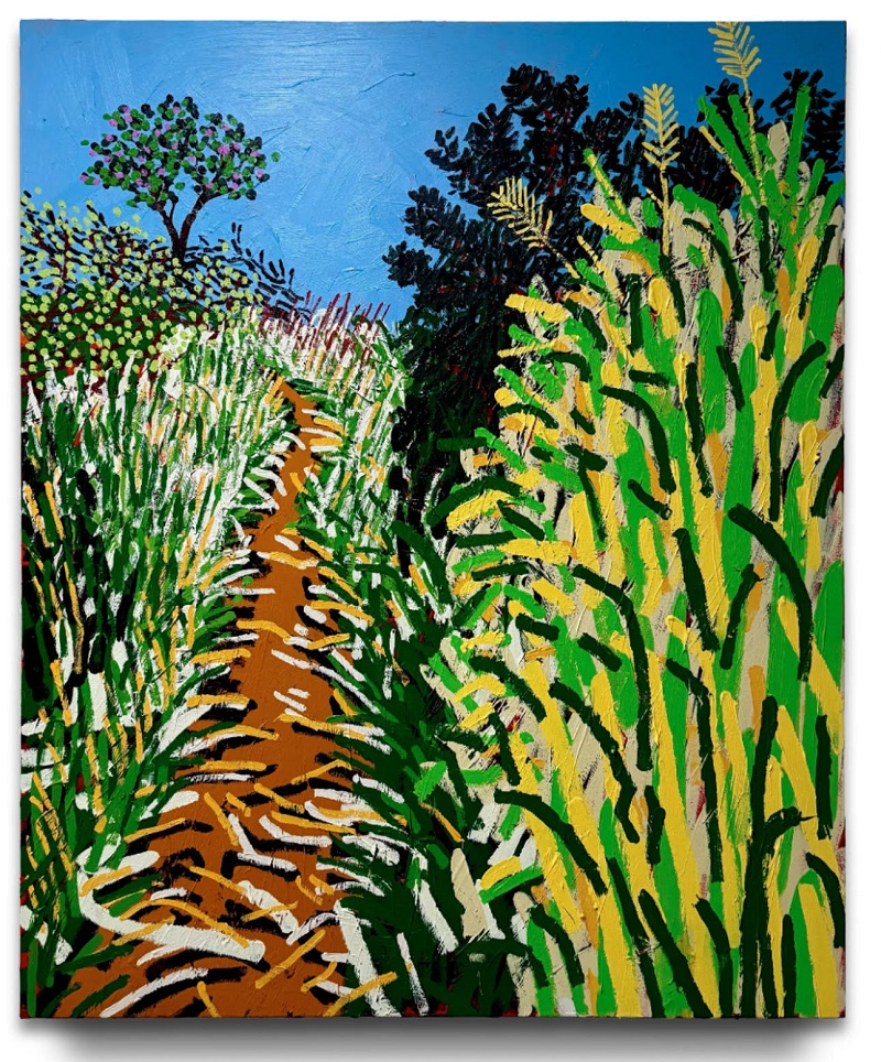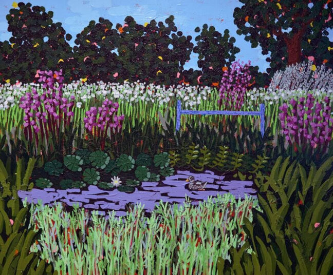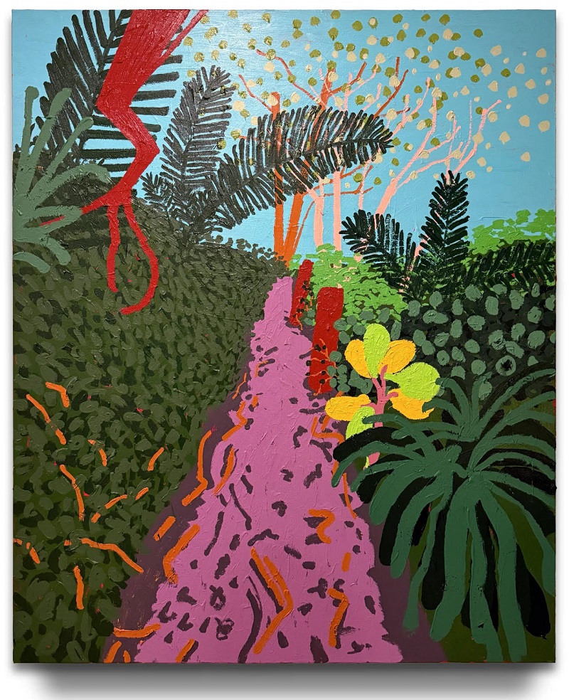 With art once again Modlin’s calling, he works in vivid color that evokes places he has seen and been. “I like to think about a place’s palette while I’m in it. Each location has its own unique set of colors shaped by the season, the light, and the energy of the place itself. I’m always thinking about how I can interact with those colors through something familiar, like a landscape,” he relates, “If you paint a tree green, no one thinks twice. But paint it pink, and suddenly people are interested.”