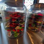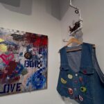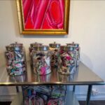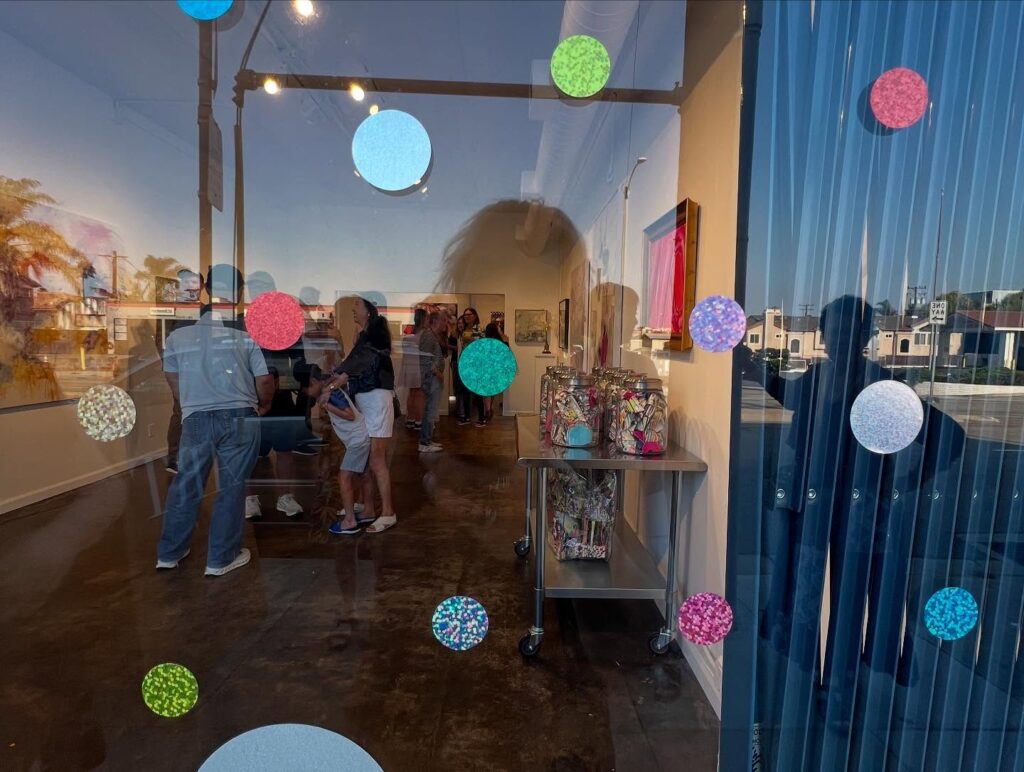 Kristine Schomaker, a tireless advocate for mental health and coping with disordered eating, is showing sculptural works that are literal pieces of her life, whether the multicolored jarred Yogurtland spoons enhanced with glitter, thread, and paint in her “Comfort and Joy,” or creations made up of her own cut up and stored painted works and life ephemera now in bags and jars on a kitchen worktable, “Picture Perfect.” It is perhaps the pieces of ourselves that come together to offer perfections/imperfections and comfort and joy to those ready to accept them. Schomaker also covered gallery front windows with iridescent dots – little marks of hope and happiness.