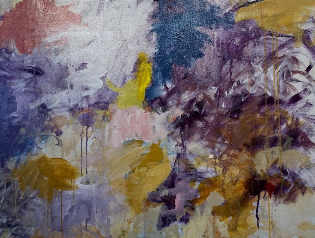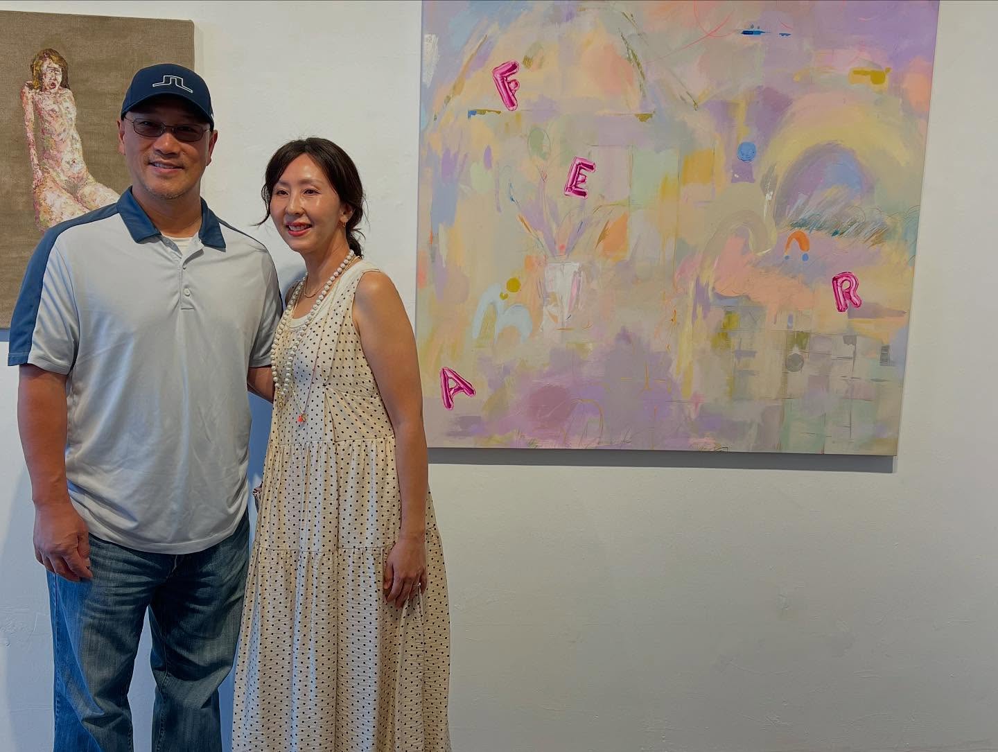 Amy Lyu’s “FEAR” is extremely moving, a large acrylic on canvas work that literally and figuratively spells out the terrifying and compelling emotion of being afraid, pulling us in with purple lettering and soft pastel abstract images.