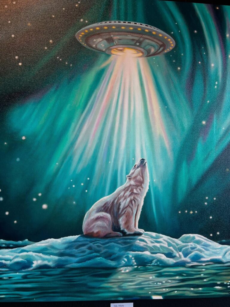 Frost’s Don’t F&$%( ING Touch Me is a true tour de force. The artist describes the show as “everything I like” which apparently includes wolves and alien spacecraft, curled up cats beneath other spaceships, Barbara Eden, the Dali Llama, angel fish, lonely landscapes, music heroes, art gurus, and so much more.