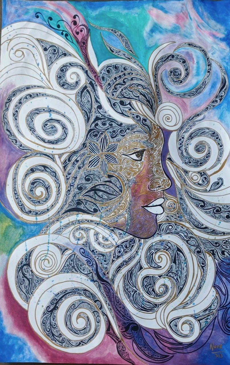 According to Noor, “My inspiration often begins with a feeling—a fragment of a dream, a fleeting glance, the rhythm of nature, or the quiet poetry of human connection. There are moments that words cannot hold, and I find myself translating them into colors, lines, and textures. My art is a conversation between my soul and the world, where each piece is born from something deeply felt.”