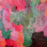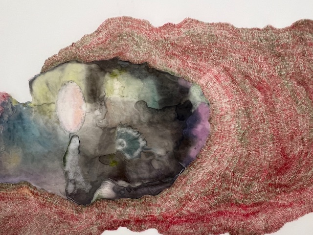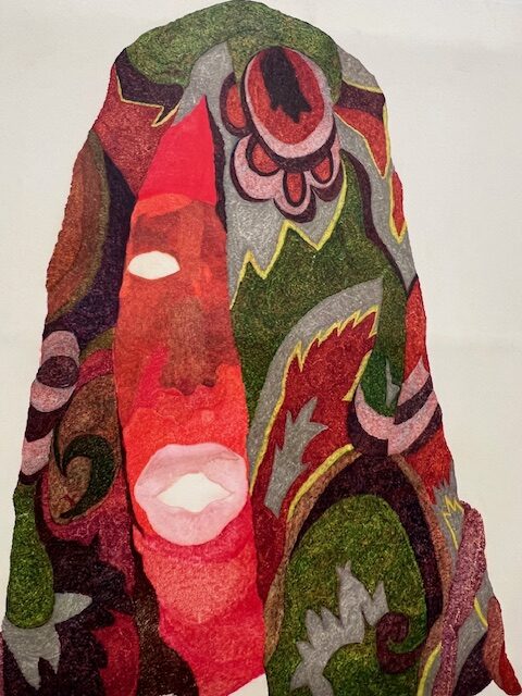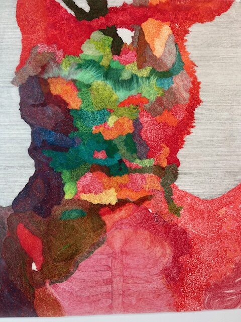 It’s only fitting to post first a tribute to Nadege Monchera Baer, a brilliantly imaginative artist whose articulate use of color and pattern, exquisite precision, and enormous artistic and personal grace I am proud to have known over the last 13 years. In my coverage of past exhibitions, I’ve touched on her versatility, her lush textures, her frankly dazzling use of materials, and her constant willingness to both experiment and offer experiential vibrancy to her viewers.