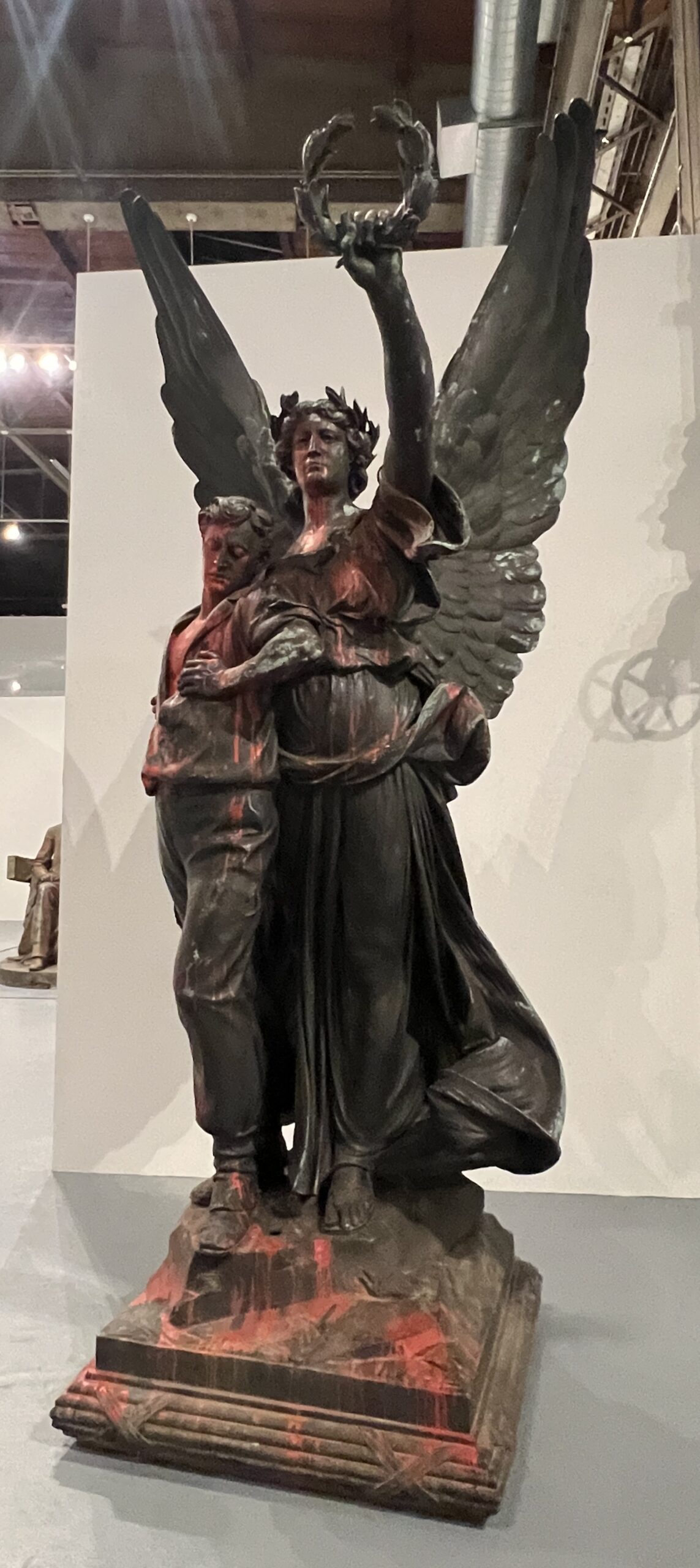 Confederate Soldiers and Sailors, 1903, by Frederick Wellington Ruckstuhl, sets the tone of the exhibition. A winged female figure, looking very mythic and somewhat Greco-Roman, is meant to personify glory. Arm aloft in a triumphant or defiant gesture, she is holding a wreath crown meant for the wounded youth she supports. Red paint was flung on this statue and other by those protesting the 2017 “Unite the Right” rallies In Charlottesville, Virgina. Subsequently it was decommissioned along with about 200 other Confederate statues. The red paint splashed on the statue is reminiscent of dried blood and is quite disturbing. It’s instructive to remember that Richmond, Virginia was the capitol of the Confederacy from 1861-1865. The historical ramifications of the Confederacy still echo today.