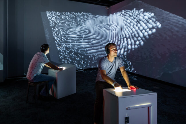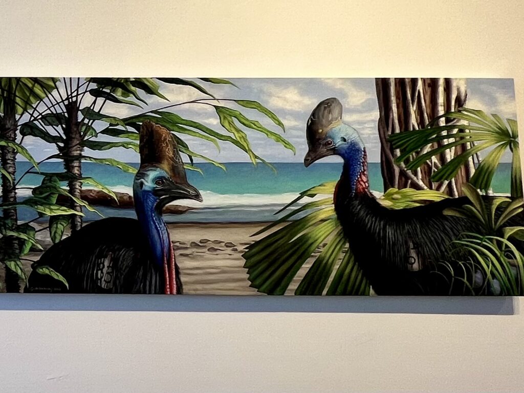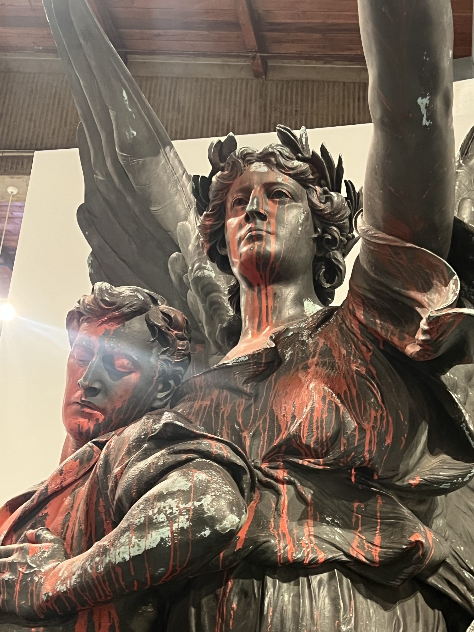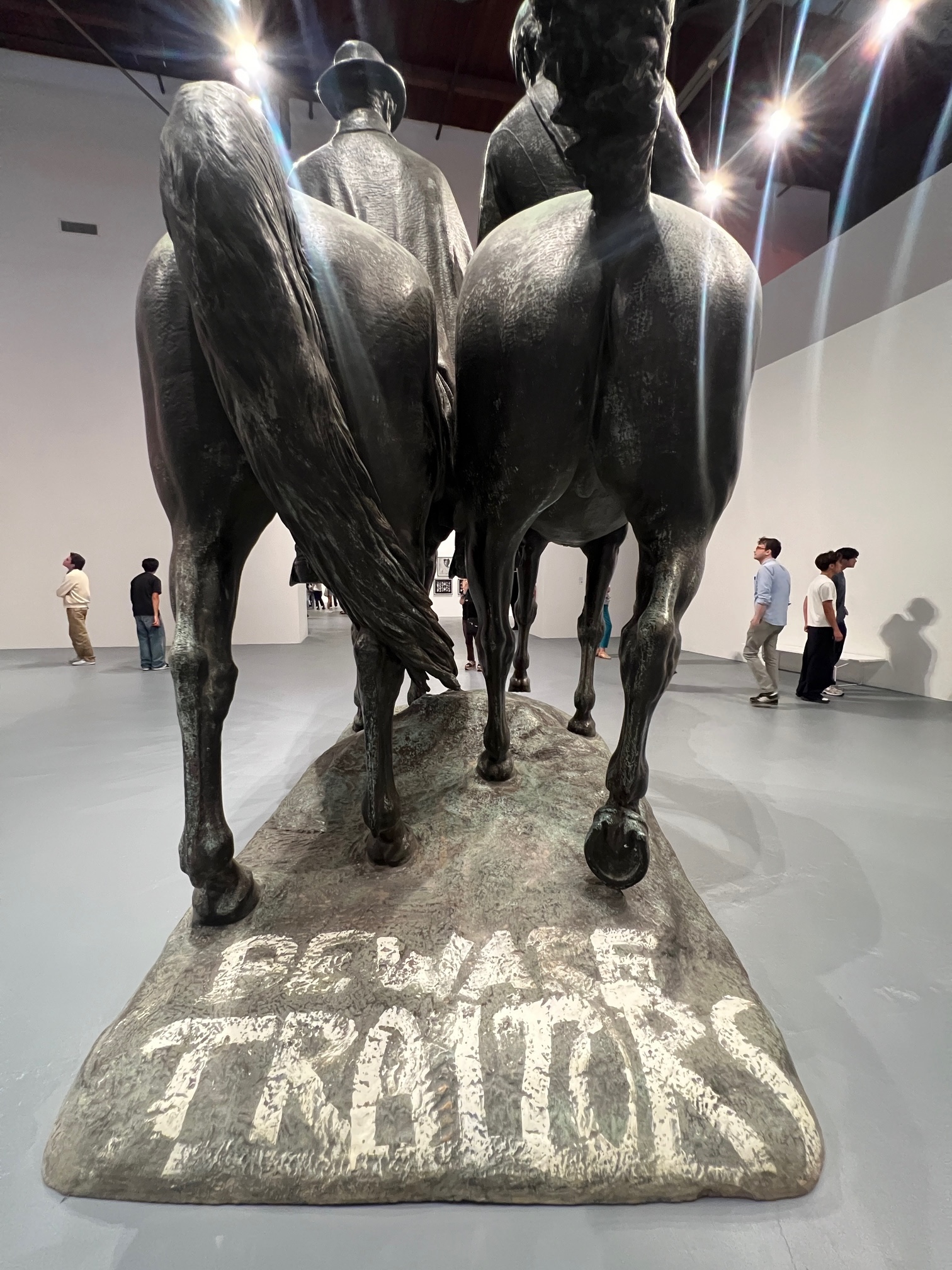 It is fitting that this striking monument which dwarfs the viewer commands the space that the curators have intentionally afforded it. Looking untouched from the front, it is only when the viewer moves behind the statues that the jarring words – ”BEWARE TRAITORS” becomes visible. This clearly encapsulates the warring ideologies presented here. Who are the traitors?