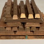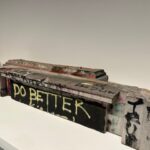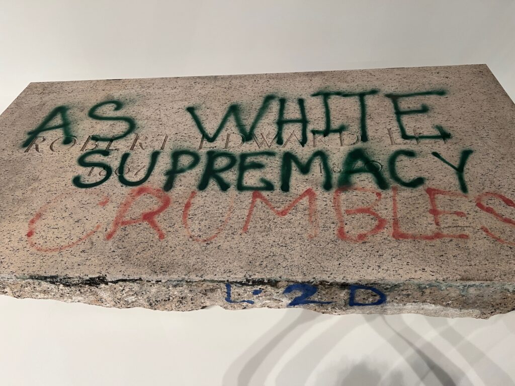 Just outside this gallery are many of the spray-painted bases that these monuments once stood on. One especially poignant one reads “AS WHITE SUPREMACY CRUMBLES….” In light of recent reversals by the current administration, this becomes a still unmet goal for those awaiting equality. Also in this first gallery are the remains of a Robert E. Lee Monument that has been melted down into bronze ingots. Stacked here like gold ingots, they are intended for a future new work of public art.