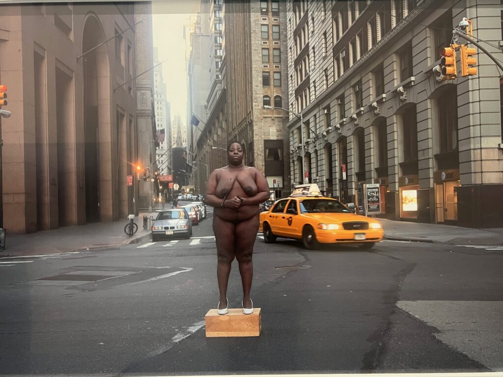 Nona Faustine’s powerful black and white self -portraits of herself naked and vulnerable clad only in white shoes or white skirt, standing alone on empty New York City streets are both brave and sad. Taken from 2013-2018, each location she picked has a particular meaning -one is where slaves were auctioned off or another is where a now unmarked burial ground for enslaved people was located. With this series, she defiantly shines a light on the history of slavery in the North as New York’s harbor was a point of entry in the slave trade.