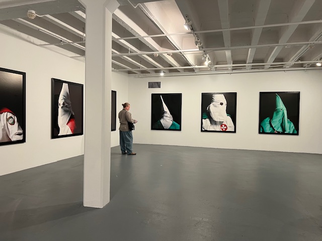 In 1990, Andres Serrano, known for picking particularly difficult subjects (such as blood, urine and other bodily secretions) photographed Ku Klux Klan members in Georgia. These images reminded me of Philip Guston’s satirical Klansman – silly in their white sheets, eyes peering out. They looked like defanged animals- all puffery, no bite. The Klan itself was founded right after the Civil War when the members suited up and ferociously attacked and killed newly freed slaves. The organization still exists but Serrano believes his photographs show that the Klan as a symbol is more potent and significant than these actual members in their white hoods.