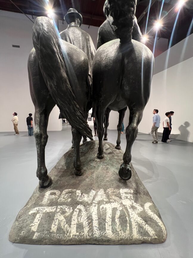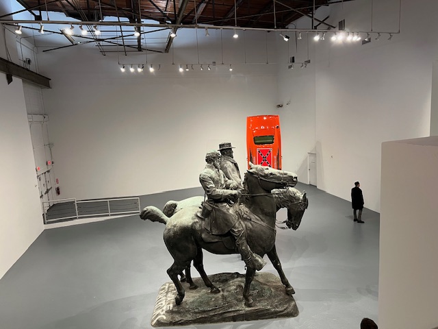 Monuments, the startling, chilling, thought provoking exhibition now at MOCA Geffen and The Brick is a must- see show. This exhibition is co-curated by Hamza Walker, Director of The Brick; Bennett Simpson, Senior Curator at MOCA; and artist Kara Walker (along with Hannah Burstein and Paula Kroll). It brings together 10 decommissioned monuments which honored the Confederacy alongside 19 contemporary artworks commissioned to be in conversation with the enormous debased statues. These works examine a particular and fraught time in our nation’s past while illuminating our present as well. We now live in a “post-truth” world that is populated by “alternative facts” and filled with competing views on our shared history. This timely exhibition requires the viewer to consider who writes history (traditionally the victor) and what, after all, is remembrance? What should or could be erased, debunked or forgotten and what are the consequences of these decisions and omissions?
