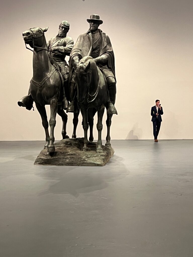 The museum wall text is incisive and extremely helpful in explaining the historical background of these epic-sized sculptures. Most of these monuments were commissioned almost 60 years after the end of the Civil War to foster the idea of the” lost cause.” The Lost Cause of the Confederacy theory is a post-Civil War concept that postulates that the war was essentially to protect states’ rights and that slavery was a helpful institution that benefited the enslaved people.