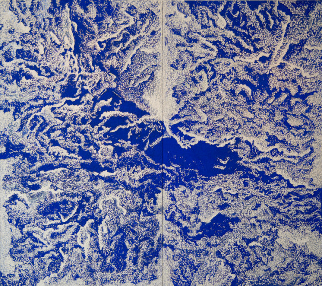 Her Bergy Bit Series of paintings is abstract, creating fierce, images of refracted light in ice and snow. Like flowers expanding or butterfly wings, these stunning blue spectrum colors shift, delicate and formidable. A Bergy Bit is a large glacial ice chunk or small floating iceberg. Perhaps now more than ever, as our environment alters, her delicate yet powerful depictions of what lies beneath the surface impression of these geologic forms are profoundly moving and graceful. Her work here evokes the pixilated dots of Seurat or even the brush work of Van Gogh up close; from a greater distance, it is a weaving of lace.