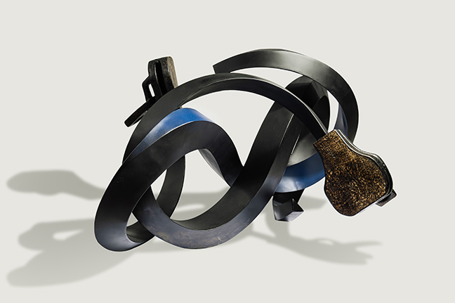 A suspended sculpture, reminiscent of Alexander Calder in shape is described by Radovanović as a “self-portrait.” The multi-armed figure has a head in the shape of a painter’s palette, while multiple arms and hands hold paint brushes. This piece also recalls the many-handed figures of Greek mythology, the Hekatonkheires.