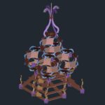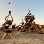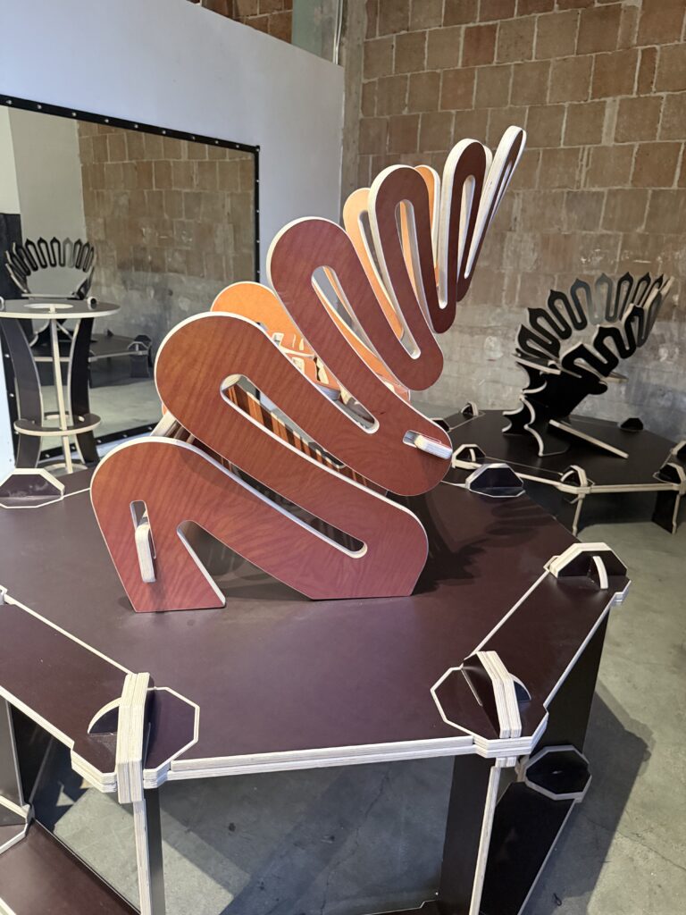 Placed in the corners of the gallery are the totems that artist shaped, conjoining wood with a wrap of dried grass and adding small plastic figures of regionally appropriate animals such as an antelope, a bear, or a red deer to this natural material.