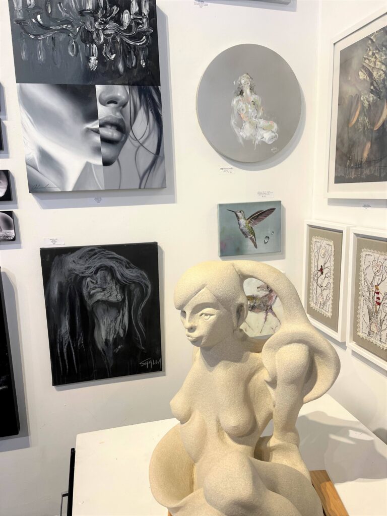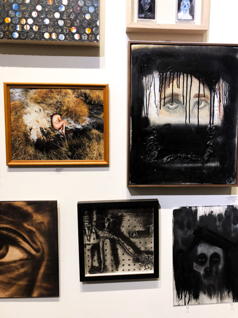 The exhibition is arranged in a classic salon style that flows in the respective sequence of each hue in the rainbow. It’s almost impossible not take a step back and look at the installation in its wholeness. Each band of color is refracted with a range of art styles and media that take the viewer on an electromagnetic & multi-dimensional journey. From visually captivating paintings and detailed drawings to tactile works of embroidery and sculpture to photographic feats that all bode their own greatness, yet meet the viewer’s eye on a level playing field— gestalt indeed.