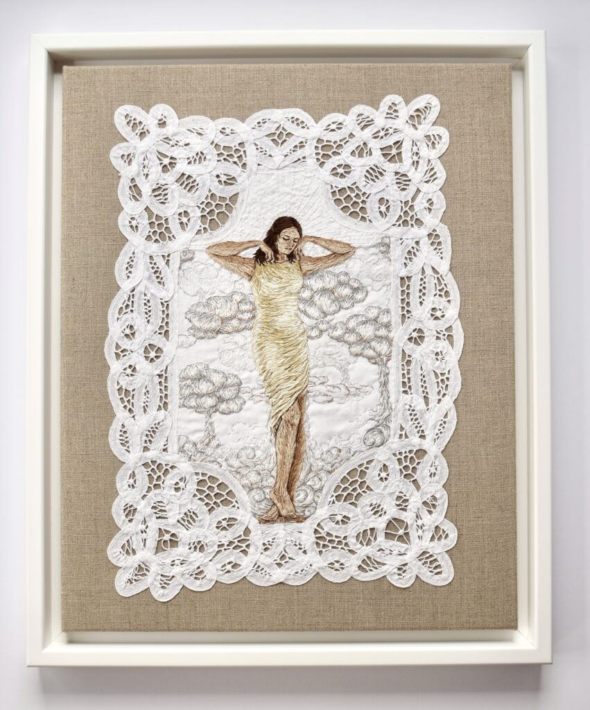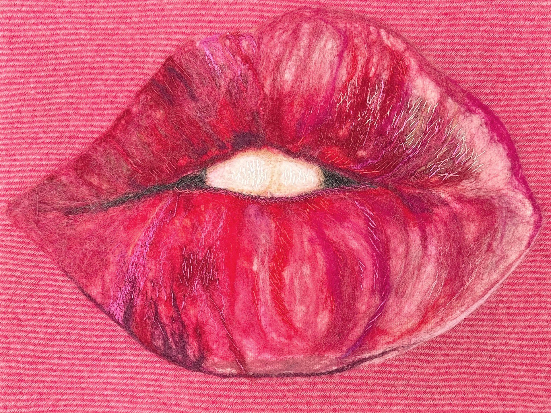 I found myself absolutely enthralled with both the painted and threaded lips of artist, Tamara Tolkin. Pretty in pink, the toothy pout of one piece is acrylic on canvas and another is a textile dream of wool, cotton, and linen that speaks to my inner (and let’s be real, outer) appreciation for detailed, yet playful precision.