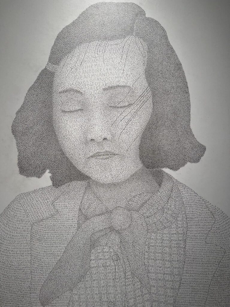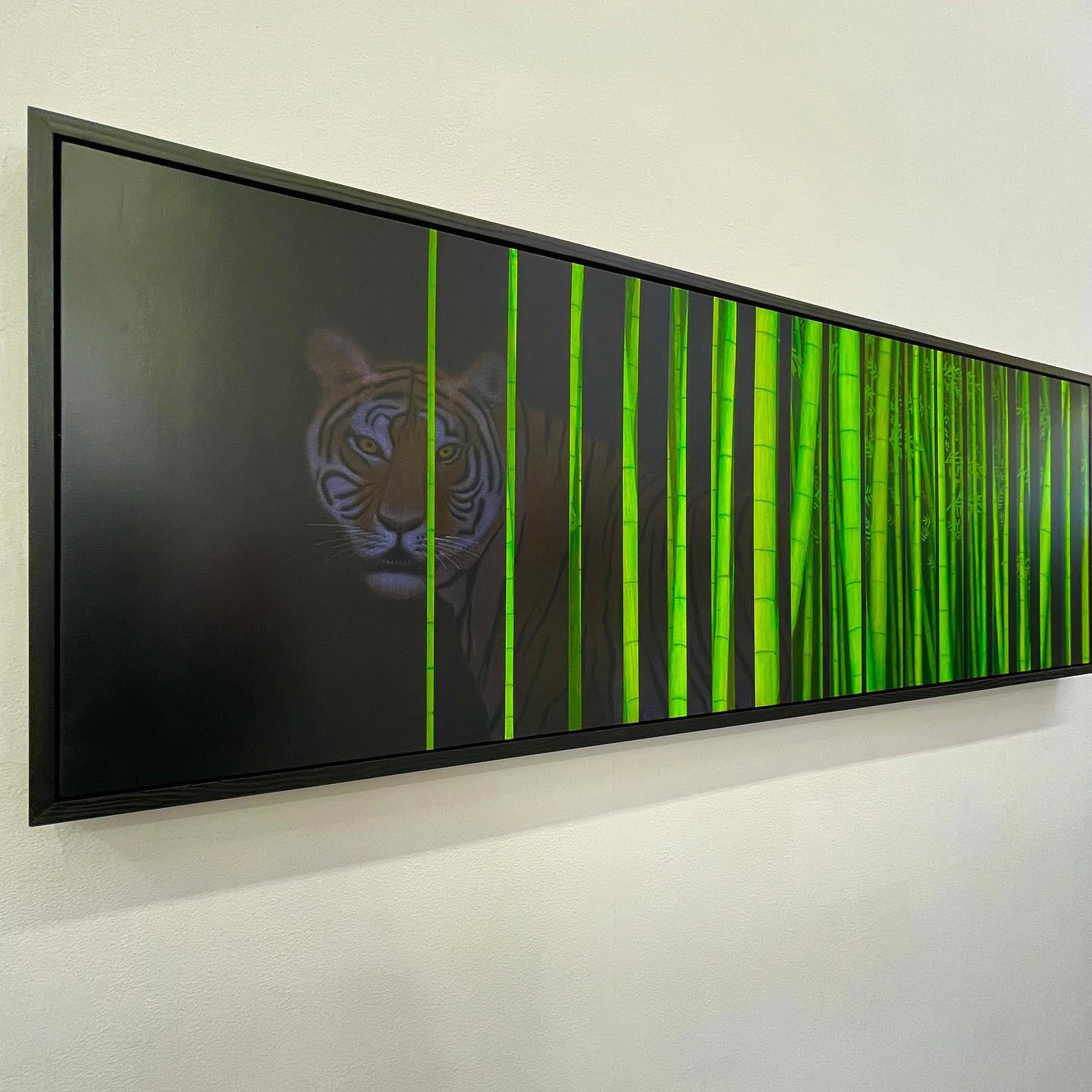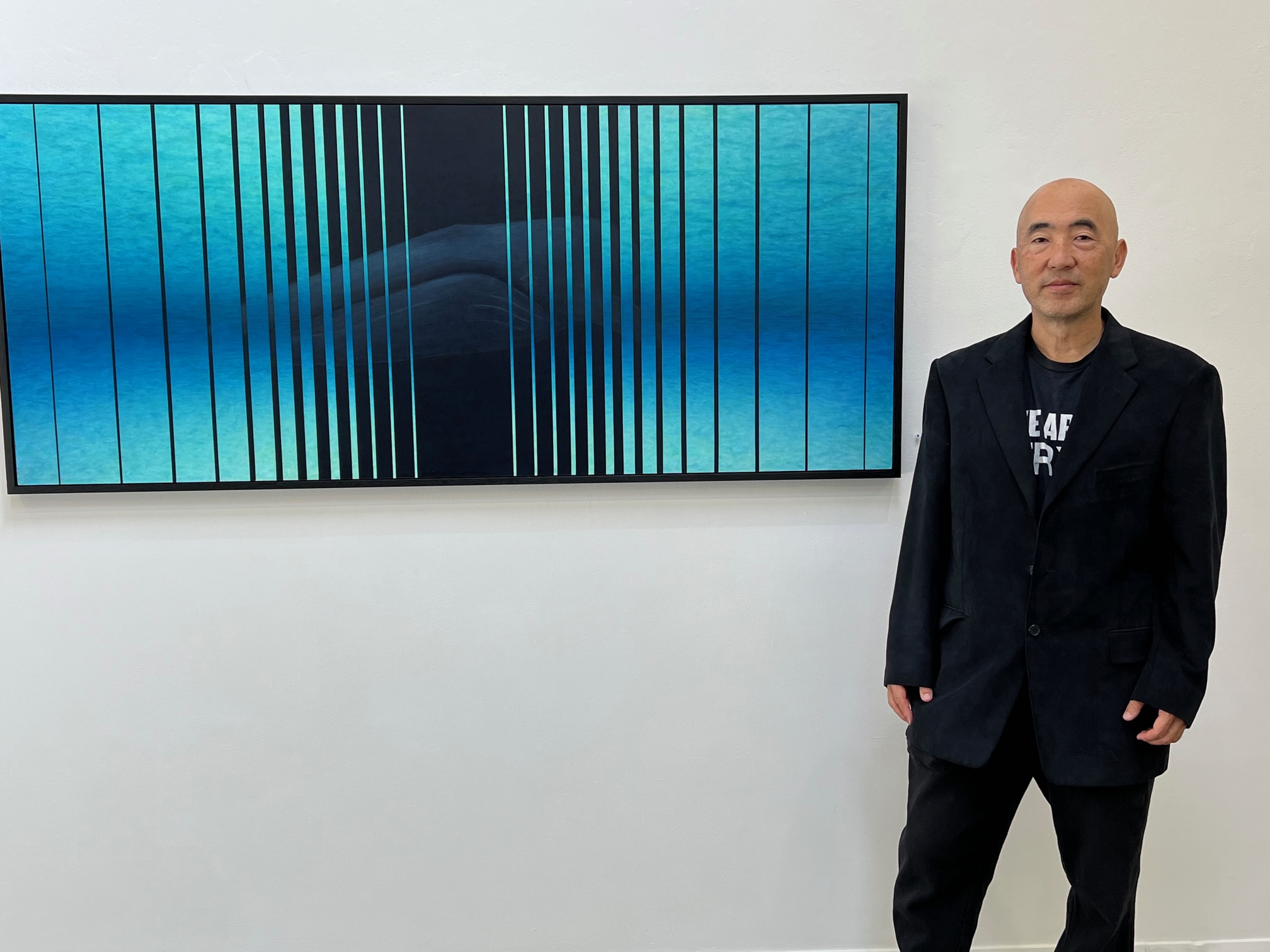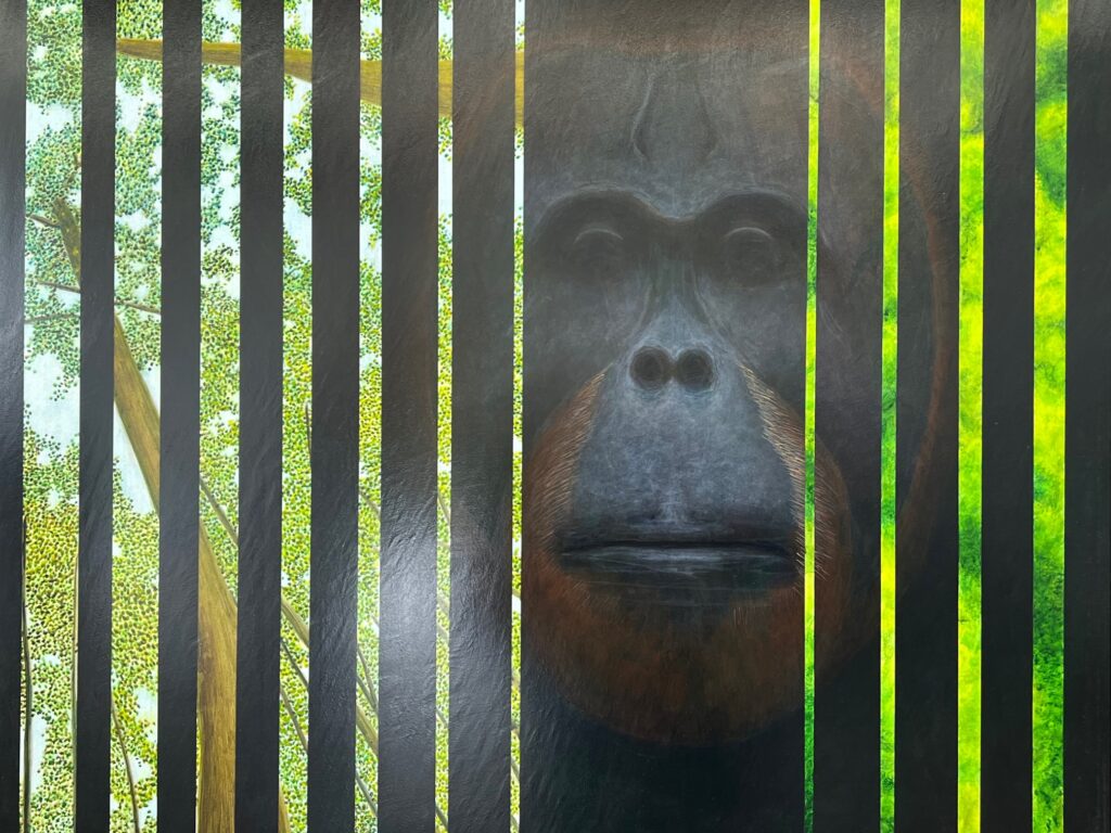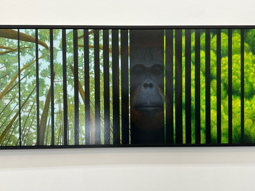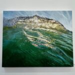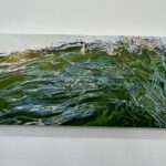 Then, as if to soothe the soul, there is the stunning painting, The Calm, 2024 with its dramatic deep horizon, orange-tinged sky flowing towards the viewer and smooth, watery surface reflecting swirling clouds. This work channels the sublime landscape painting of the nineteenth century Romantic painters that focused on emotion, evoked by the wonders of nature.