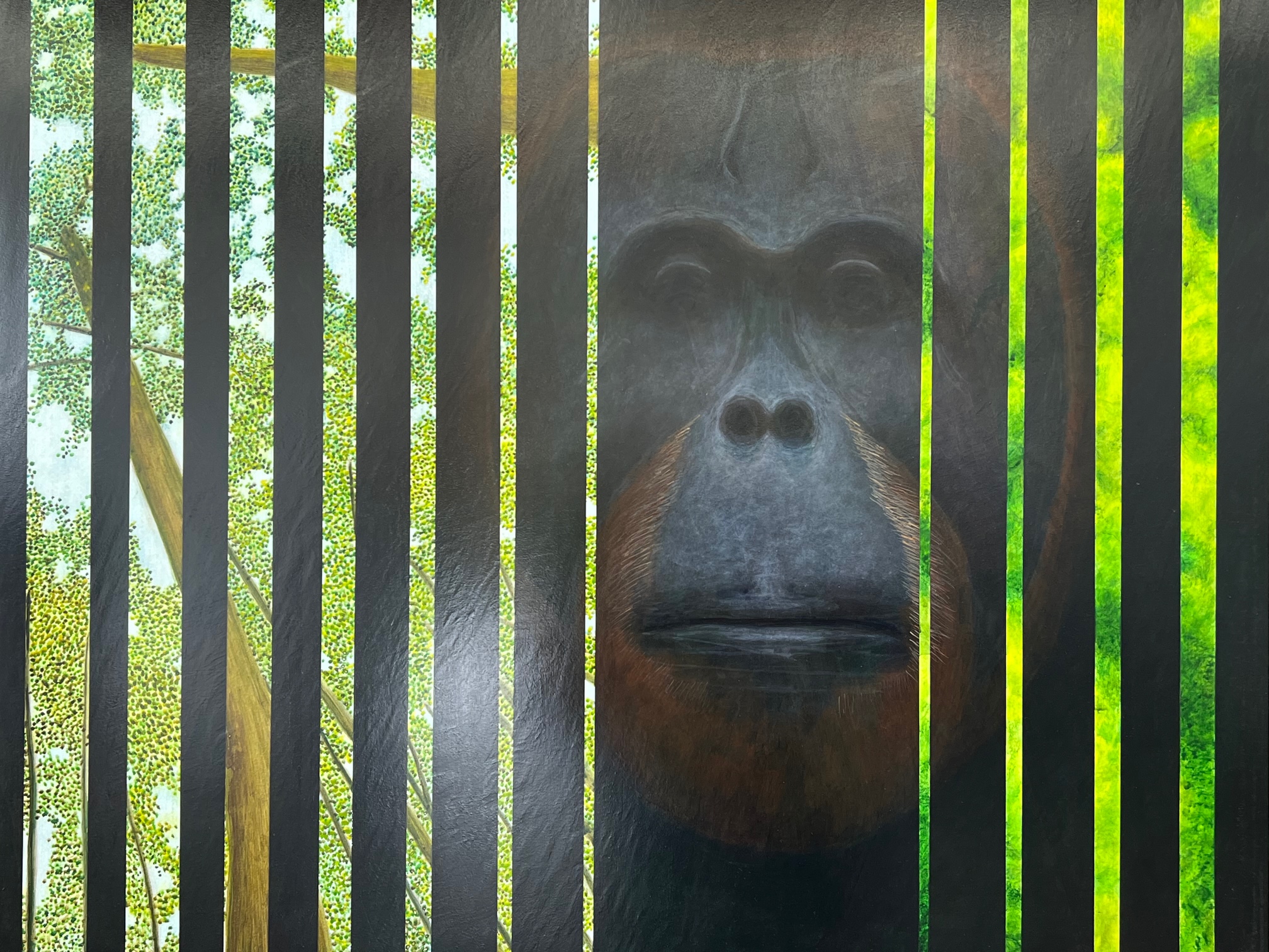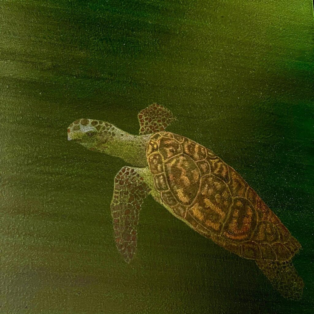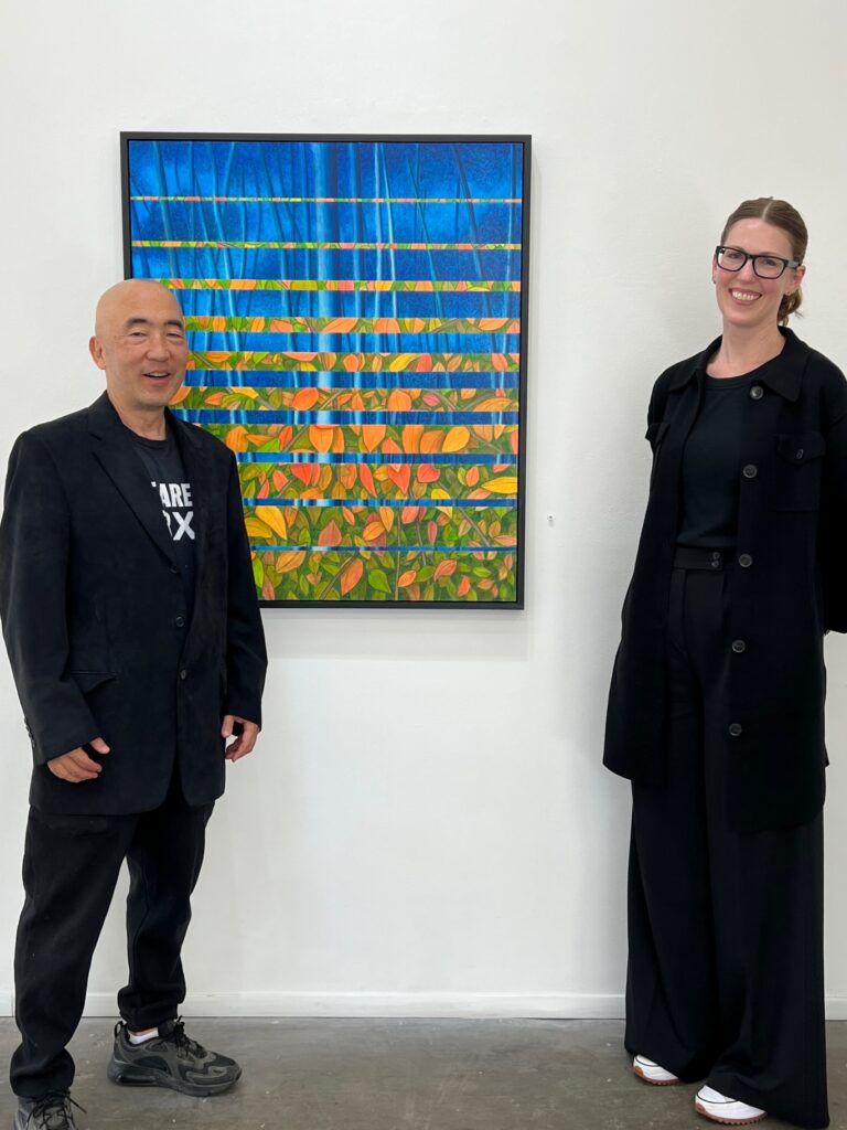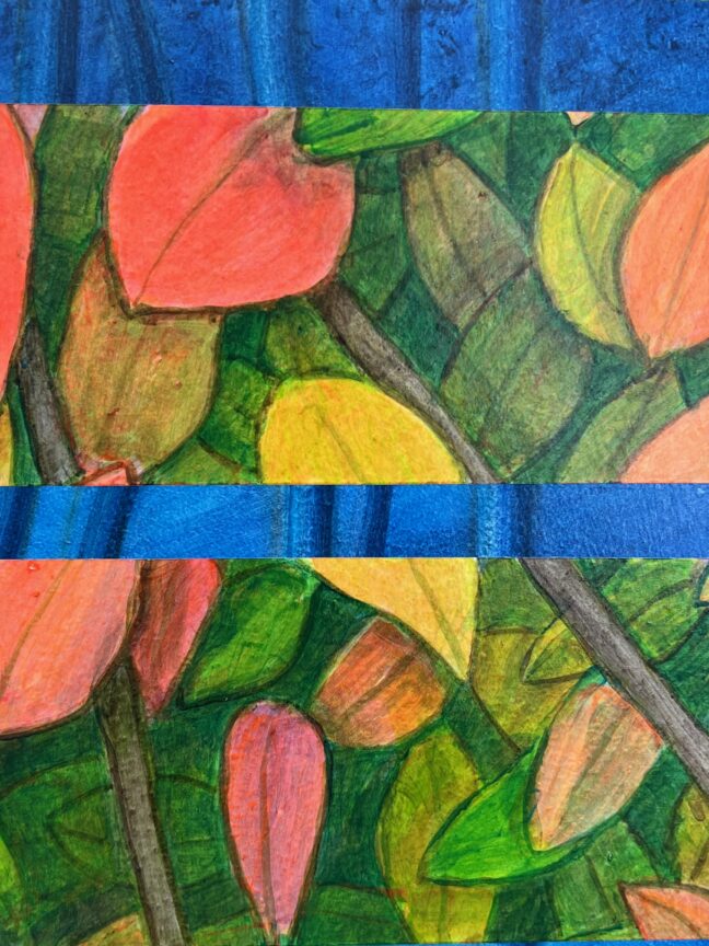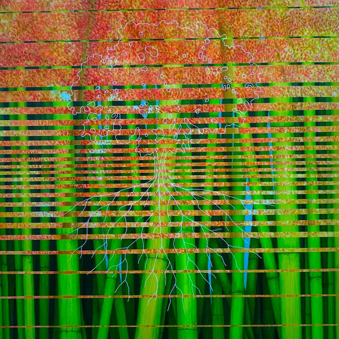 A case in point is Autumn 2024, where sky and fall foliage appear to be reflected in a shimmering watery surface. At the same time, in the lower right corner, a dark shadow appears both on the surface but also like a hole disrupting the picture plane. It speaks to what may be lurking underneath. The title may be a clue to the meaning and context of the piece. Autumn is a transitional time from the carefree days of summer to a frigid winter and functions as a poignant metaphoric allusion to the later stages of one’s life.