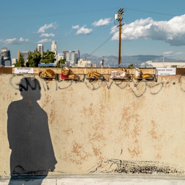 Bleep: The food items are contained in clear acrylic boxes with air holes to expose the burgers. We affixed the box to the side of building. (Co-conspirator/artist) Plastic Jesus pretty much built and advised the project. I can’t even begin to say how grateful I am for the help. The location? That cannot be dispelled.