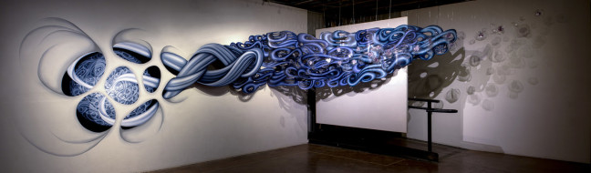 She has created a portion of her work on the gallery wall, the doorway or portal into three dimensional elements that could be ocean or tissues, geometric patterns, blossoming seeds.