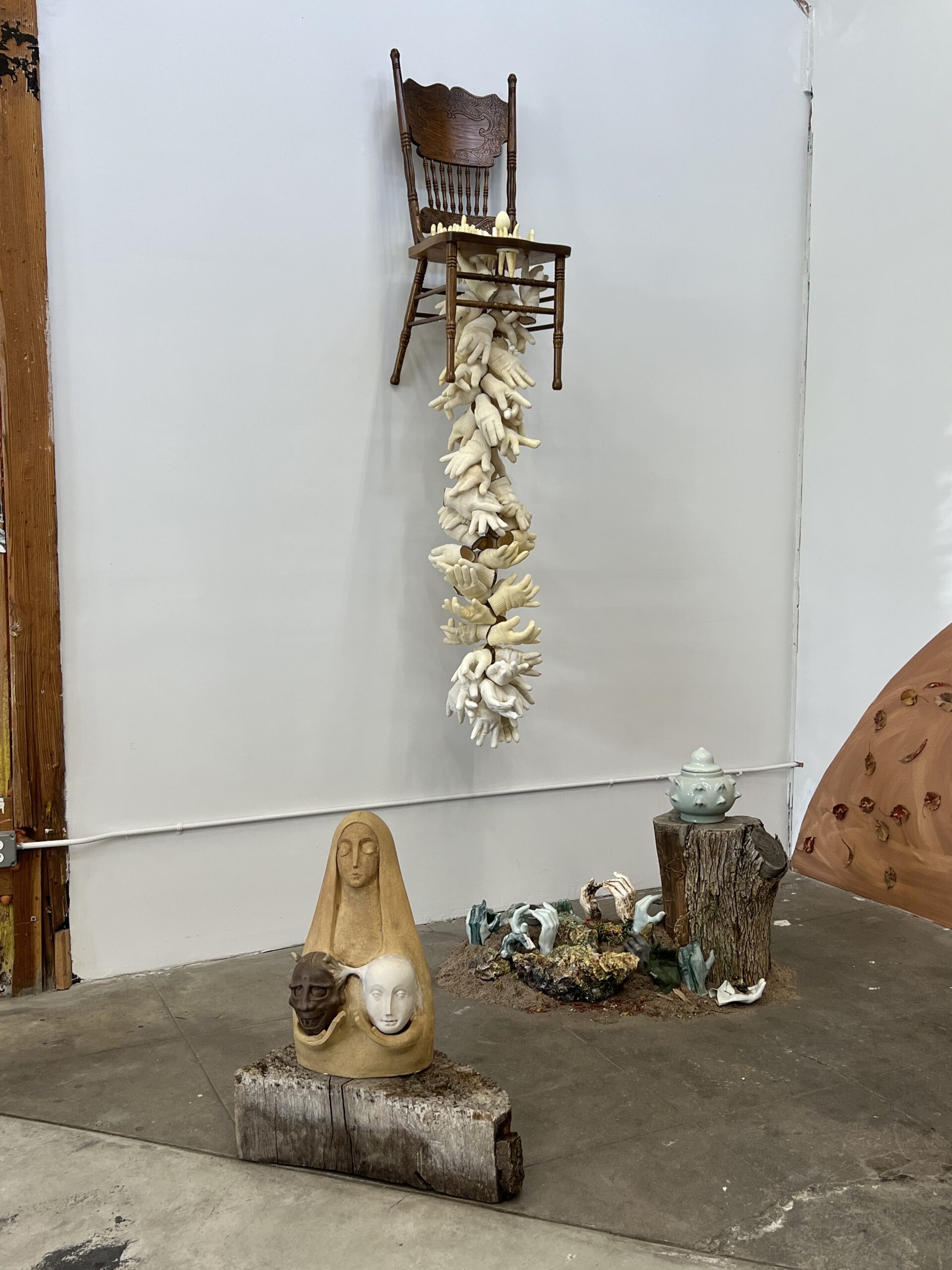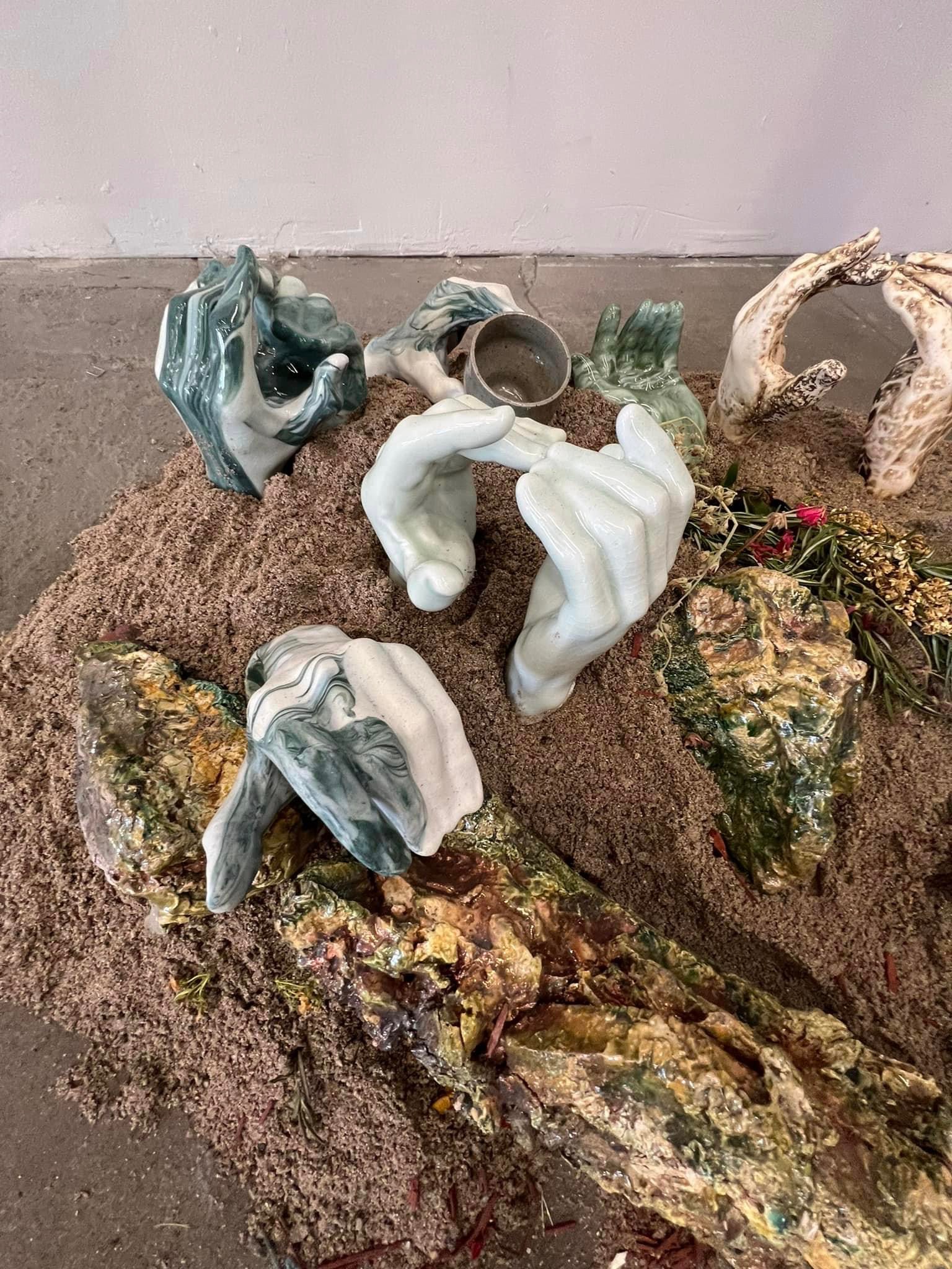 To the left, some pieces mounted in soft dirt, are the lustrous ceramic and clay works of Sean Yang. There are four separate installations: “Filial Piety,” gives us resin cast gloves forming a kind of lei, draped off a wall-mounted chair; in pale sea green “Four Noble Truths” and “Noble Eight Fold Path,” are a perfect poem of ceramic and porcelain; while hands in a variety of oceanic shades protrude from the aforementioned soil display in Earthly Delight, an installation that contains ceramics, porcelain, and raku glazes. With a Madonna-like bearing, a female form contains two heads, one devilish, one peaceful in “Hanya,” which uses ceramics, Nara porcelain and metal oxides in its creation.