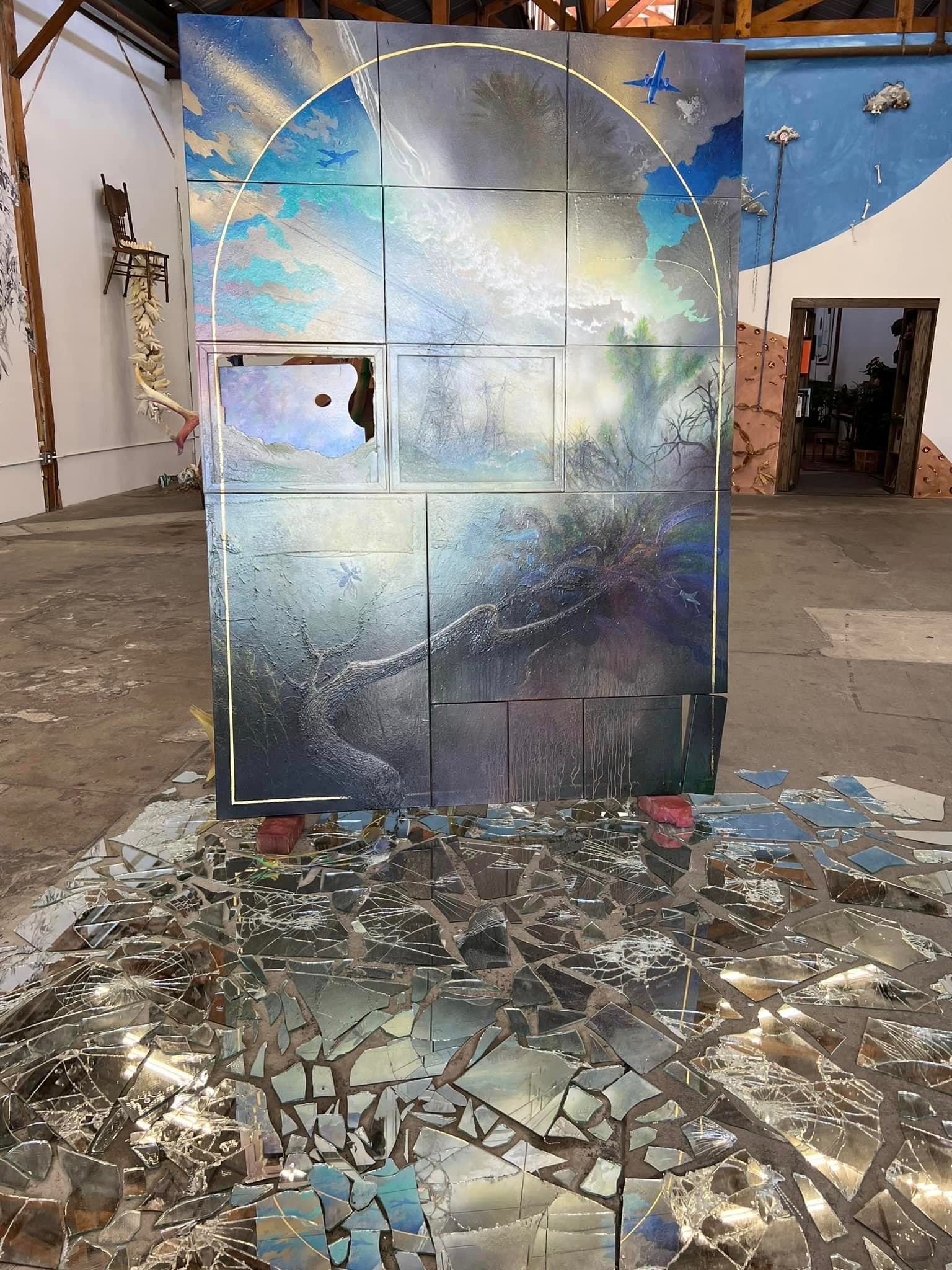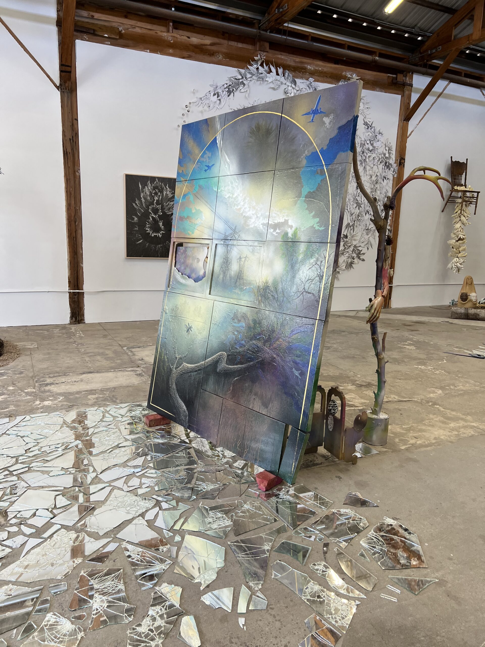 In the center of the gallery, powerfully reflecting Jenn’s back-wall piece as well as Bifulco’s, and others in the gallery, is a spill of mirror pieces that co-curator Vojislav Radovanovic uses like a pool, from which arises an incredible installation that resembles a church window in the heavens. Irridescent, luminous, and a simply vibrating mix of color, his “Painting for a Liminal Sanctum,” is a soaring song of mixed media on canvas. On the backside, wood shapes, plastic, and concrete forms support, both physically and emotionally, this rich glowing rainbow, a vision into an unseen universe embedded with small, delicate drawings within its hypnotic glow. It’s an enormously powerful piece that epitomizes the title and the intent of the exhibition as a whole.