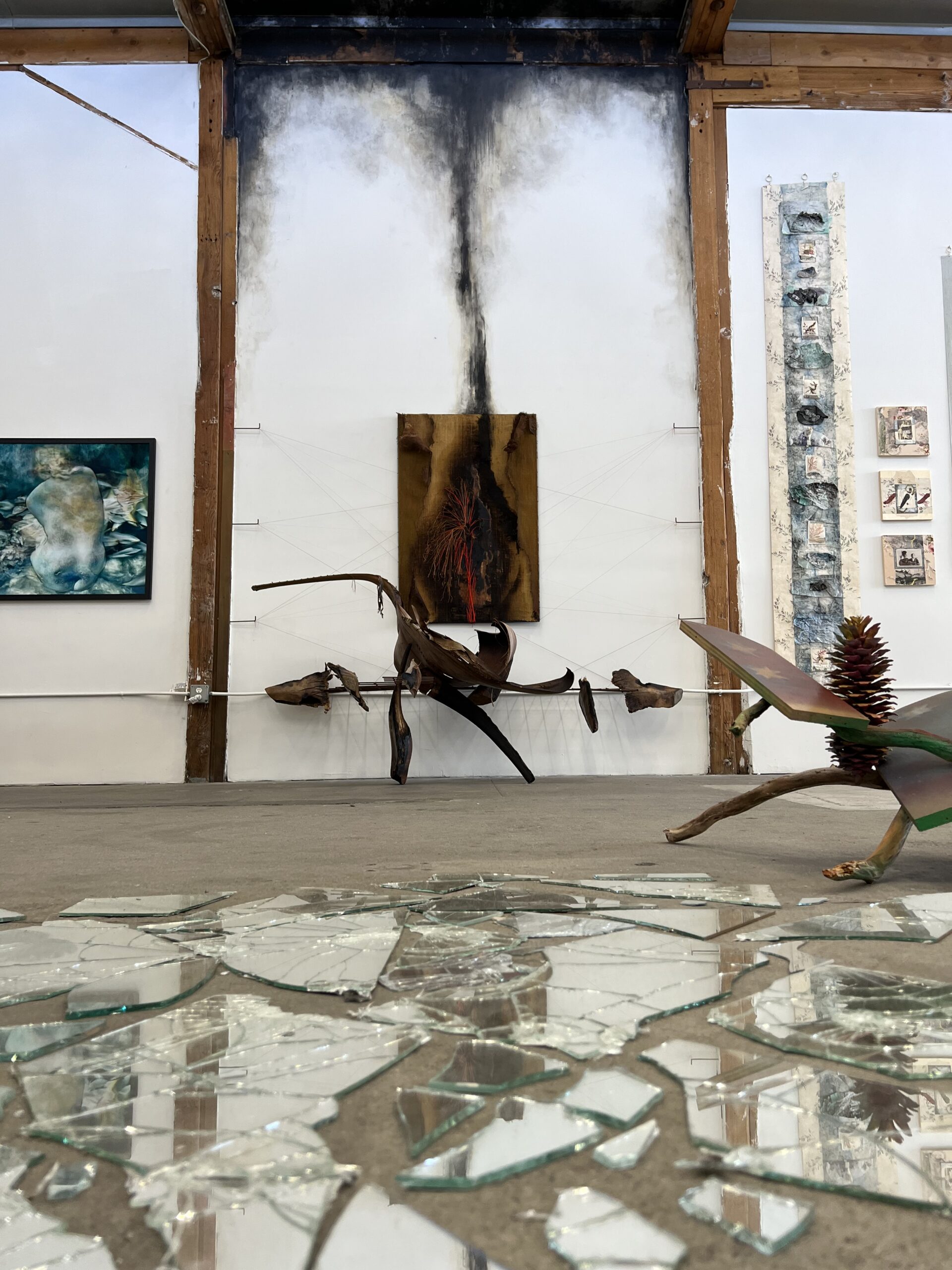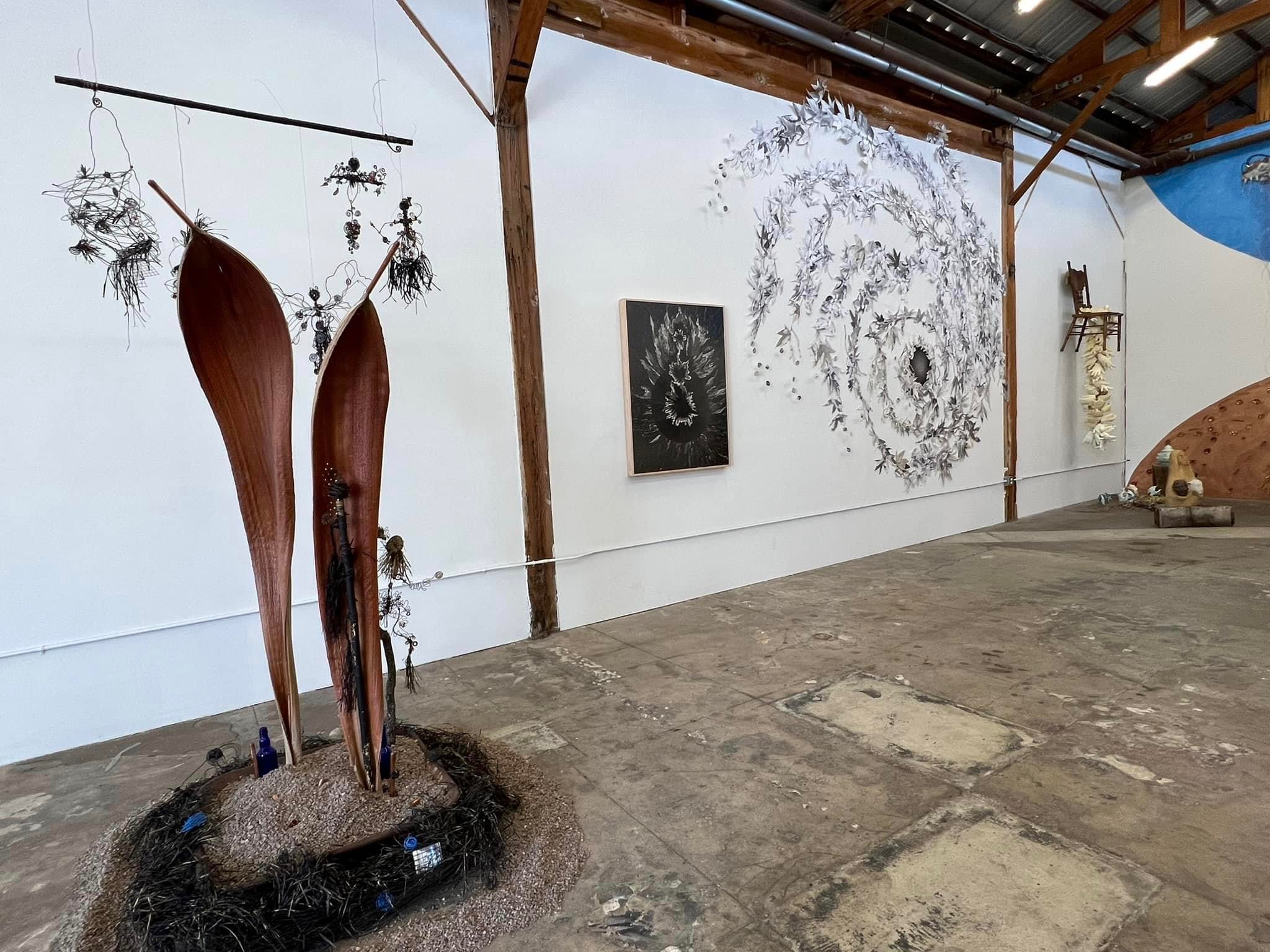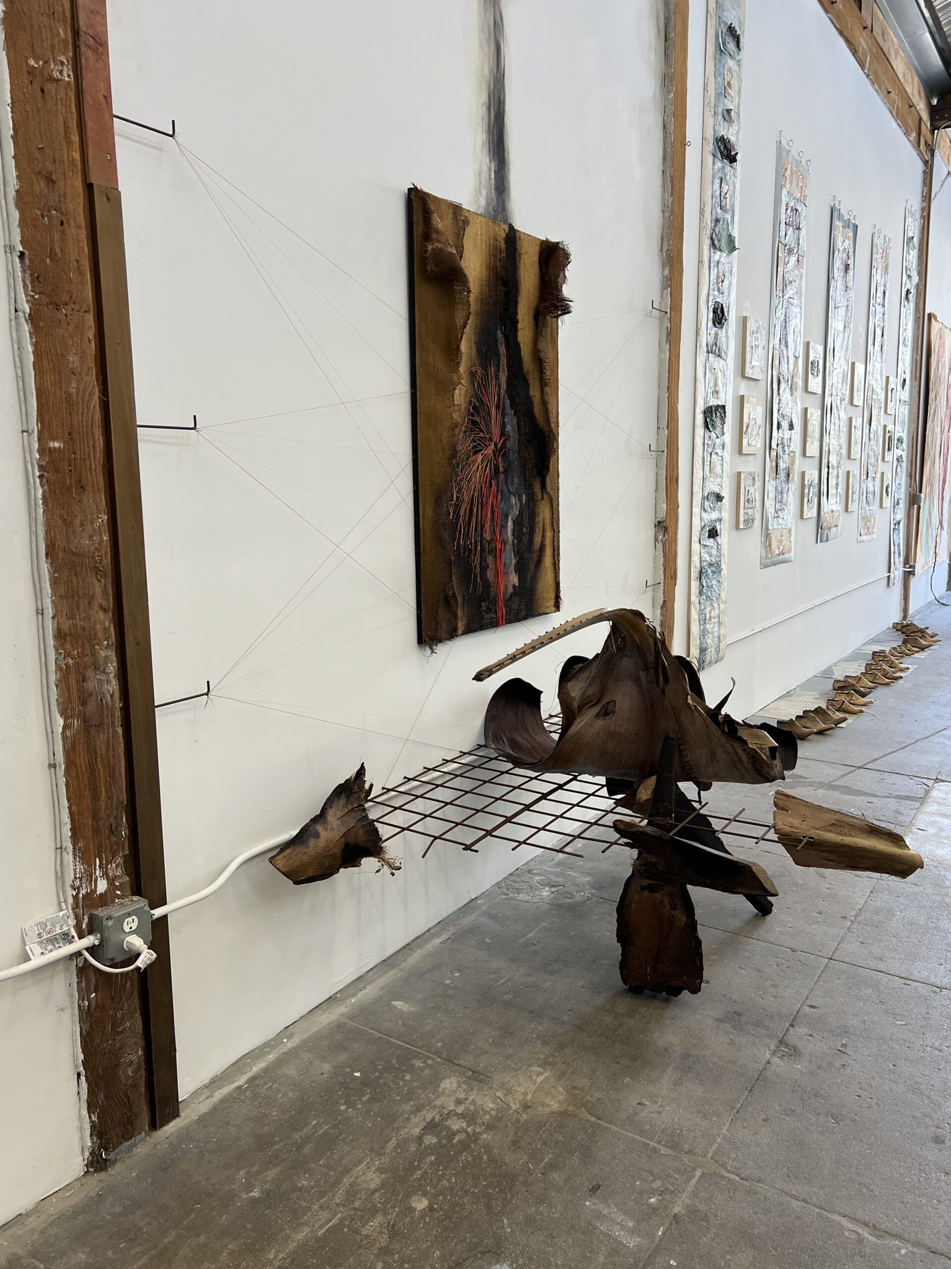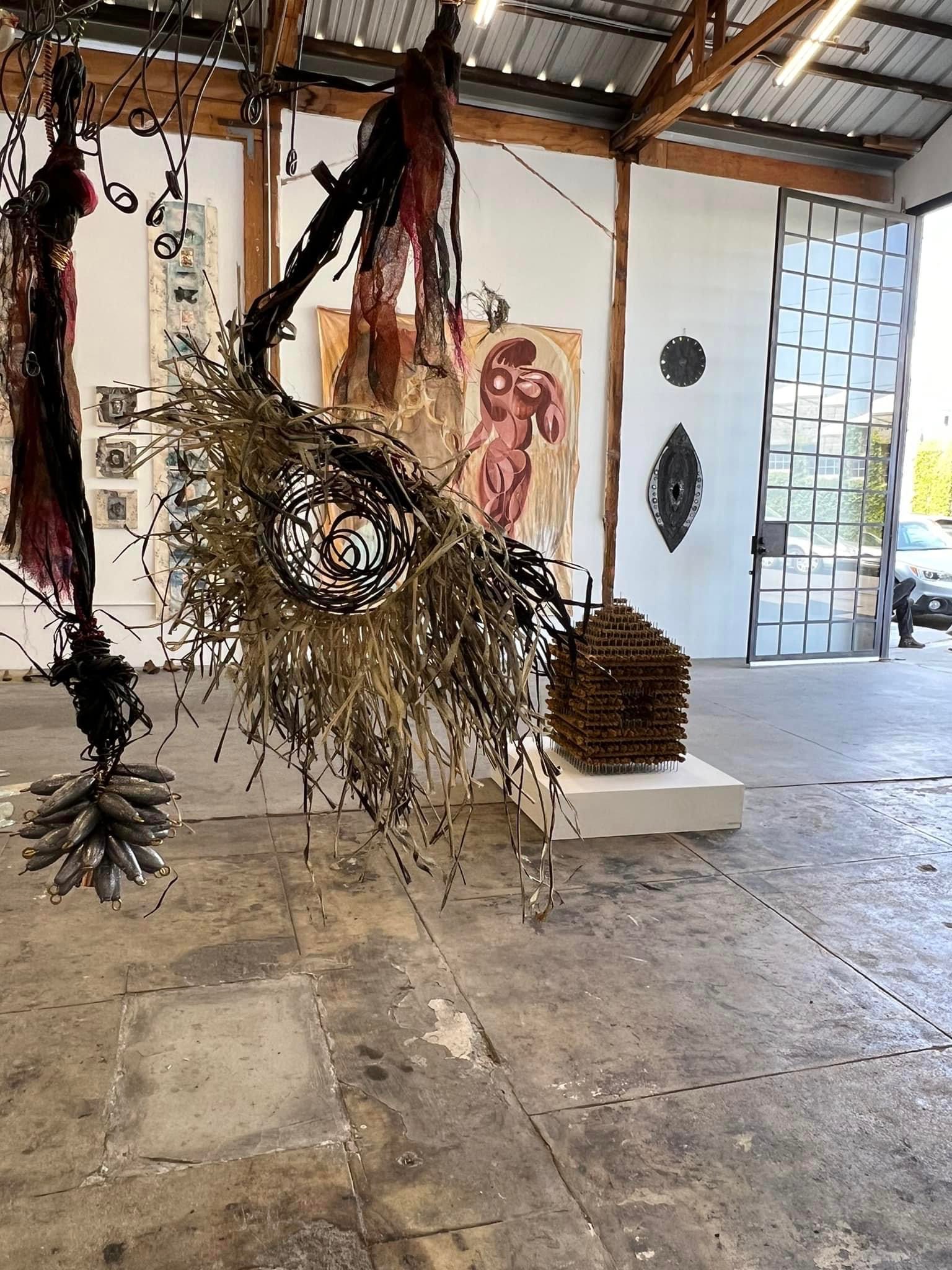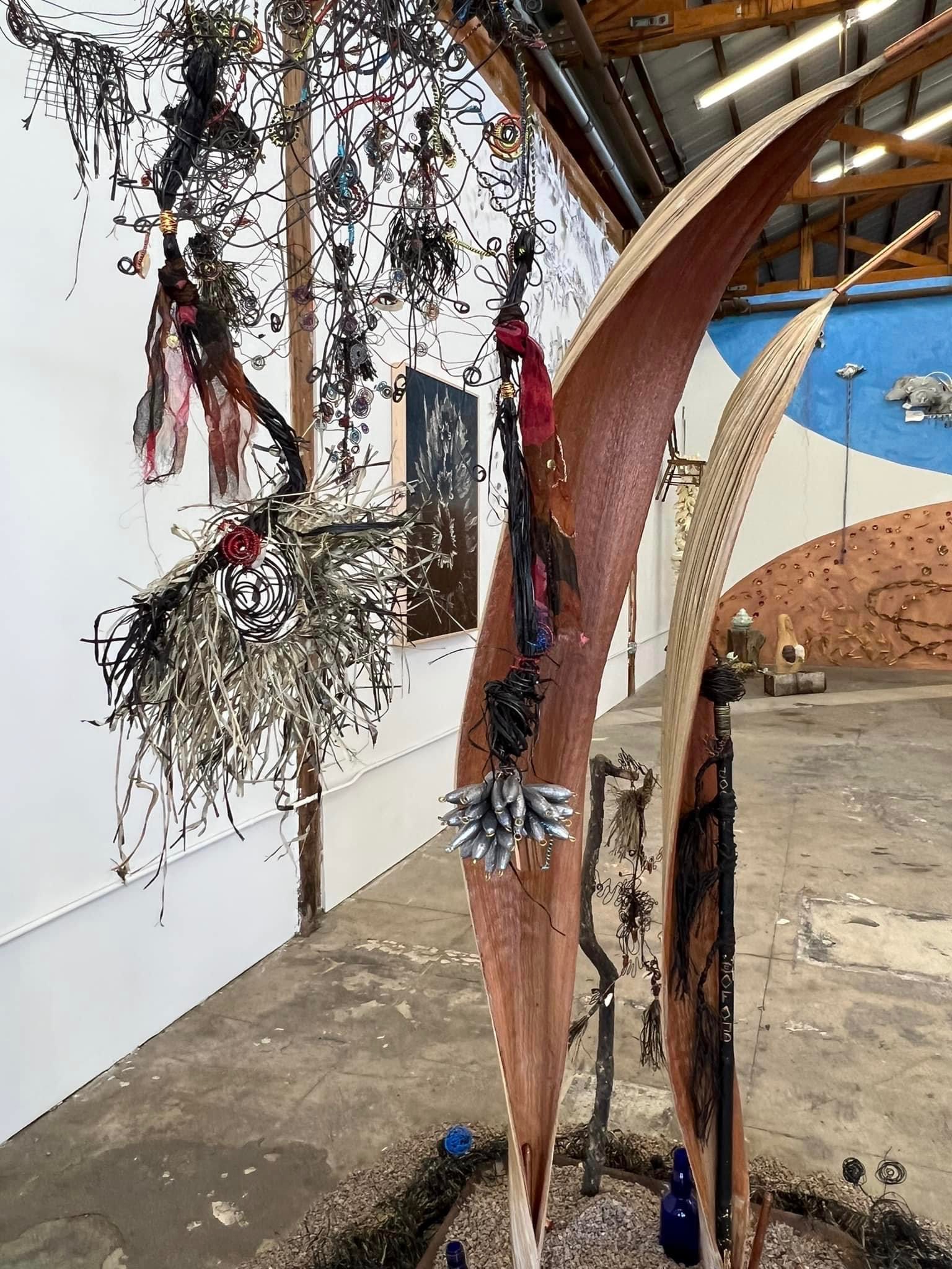 Next to it is a tornado of site-specific smoke curling upward like a magician’s experiment from the curved natural sculptural forms created by Francesca Bifulco in “Wound Over the New Ground. ” Here, burnt burlap and wood with hand-stitched cotton thread is used along with a found palm frond and custom-built metal climbing spikes. It is plant and fire, smoke creature arisen from a jungle detritus, magnificent and fearsome.