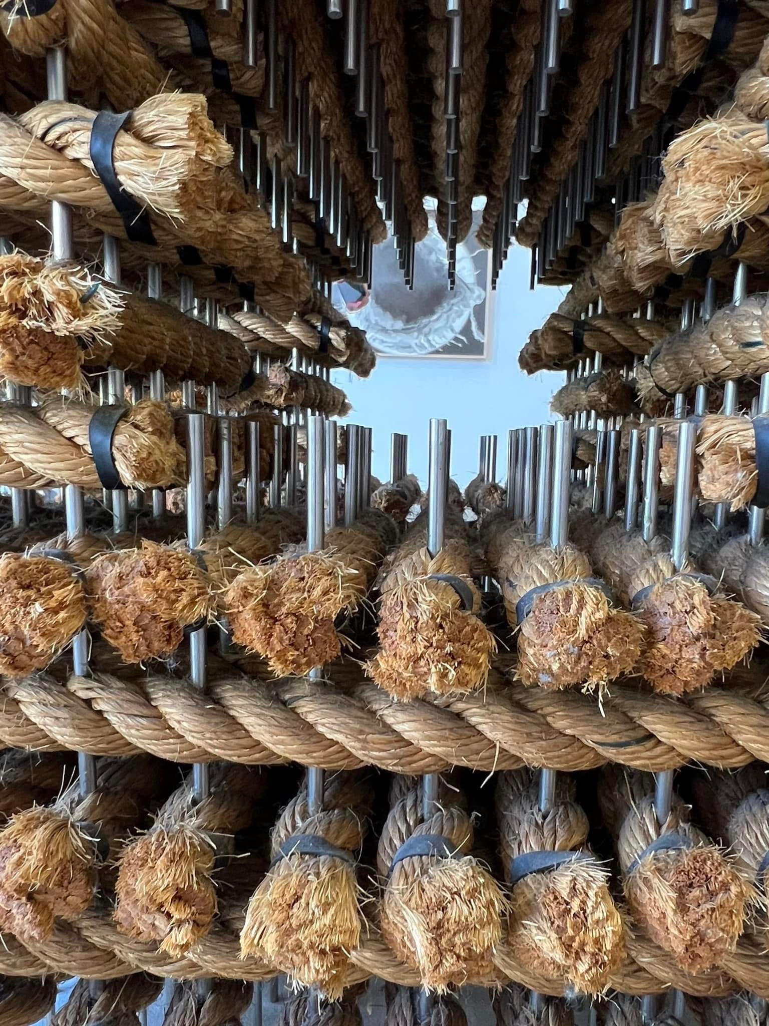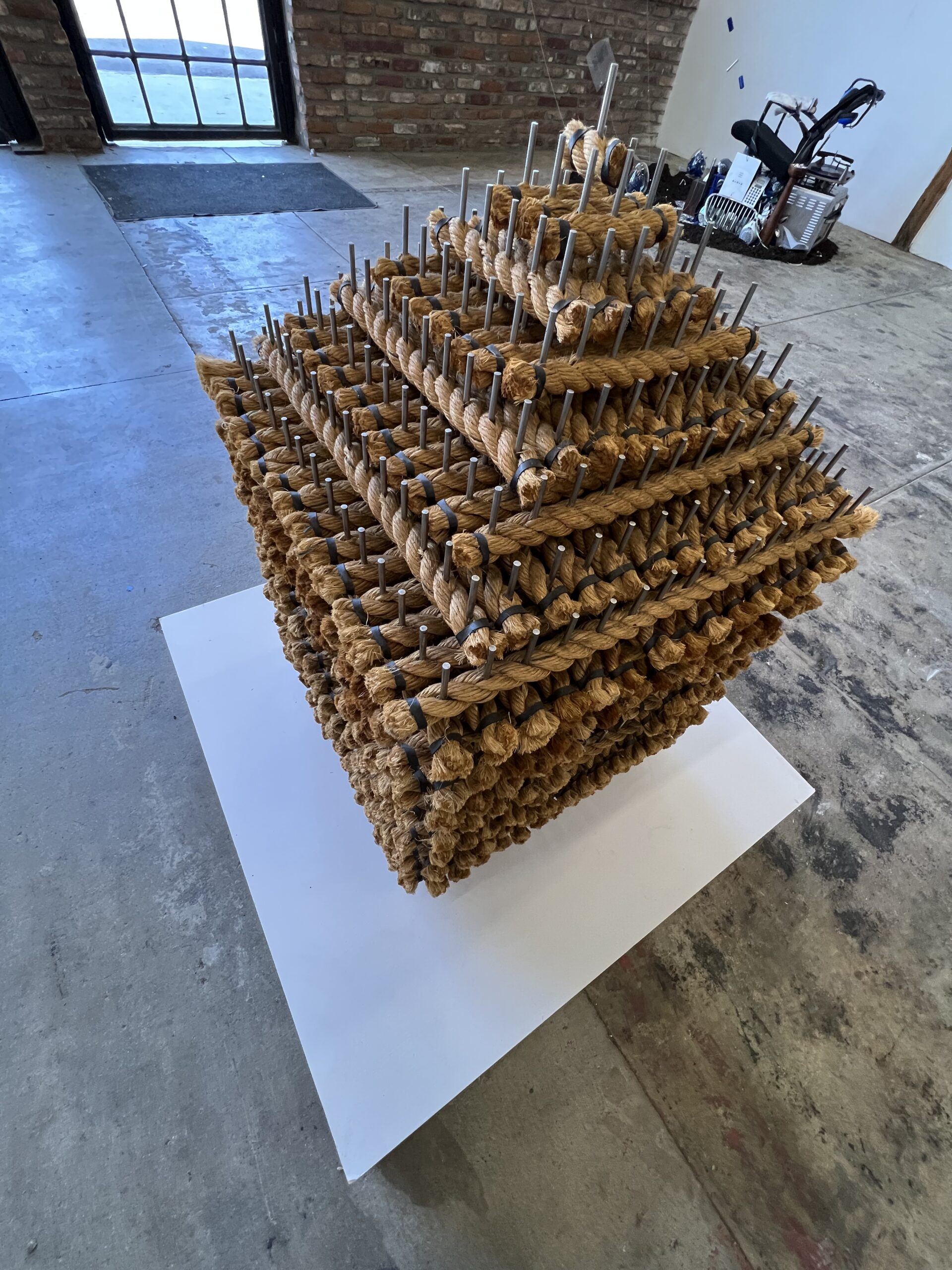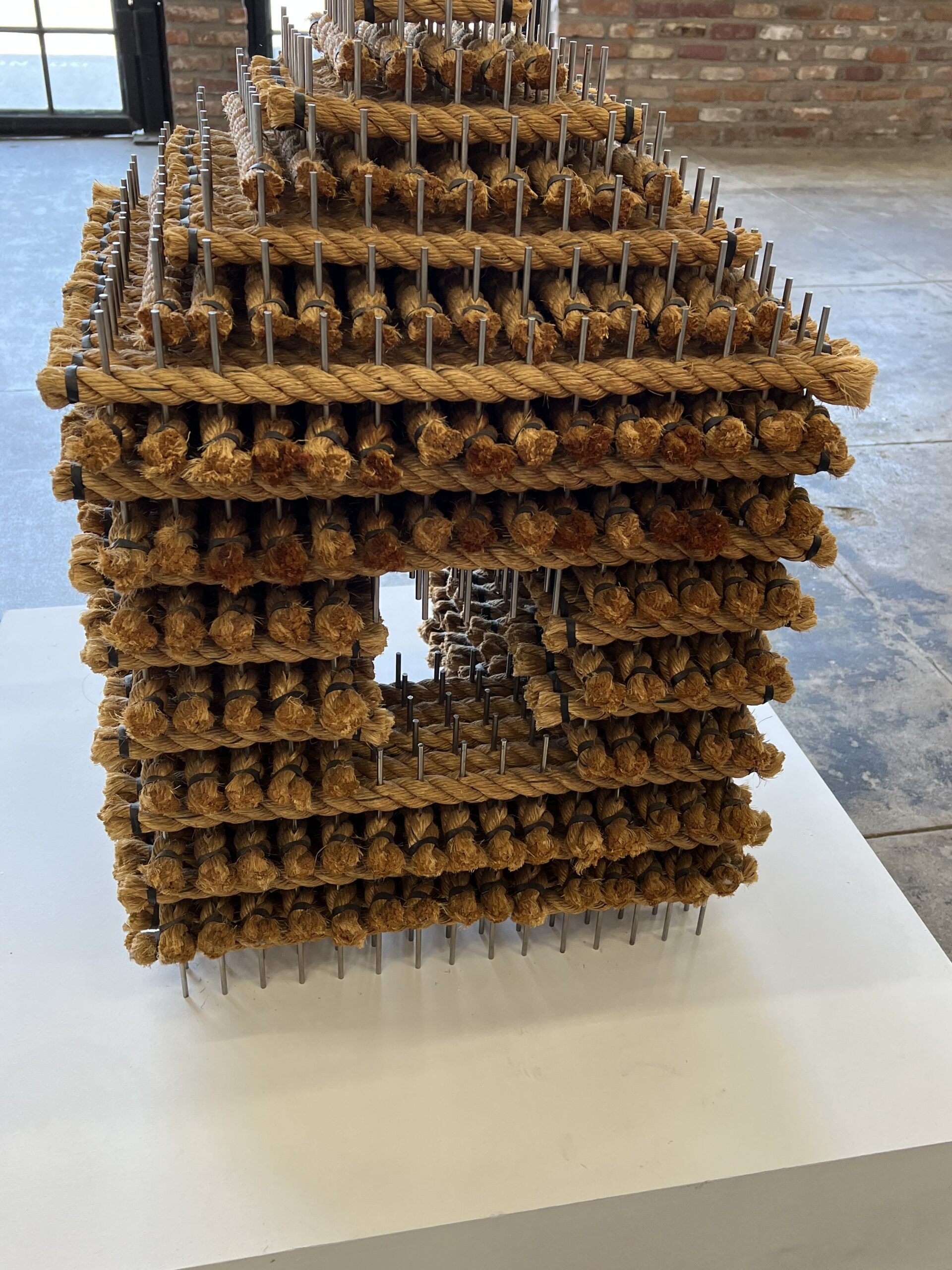 Forming a kind of temple is David Hollen’s precise and absorbing “Ordered Heap,” a geometric gem constructed of hemp rope, stainless steel, and rubber, in earthy beige.