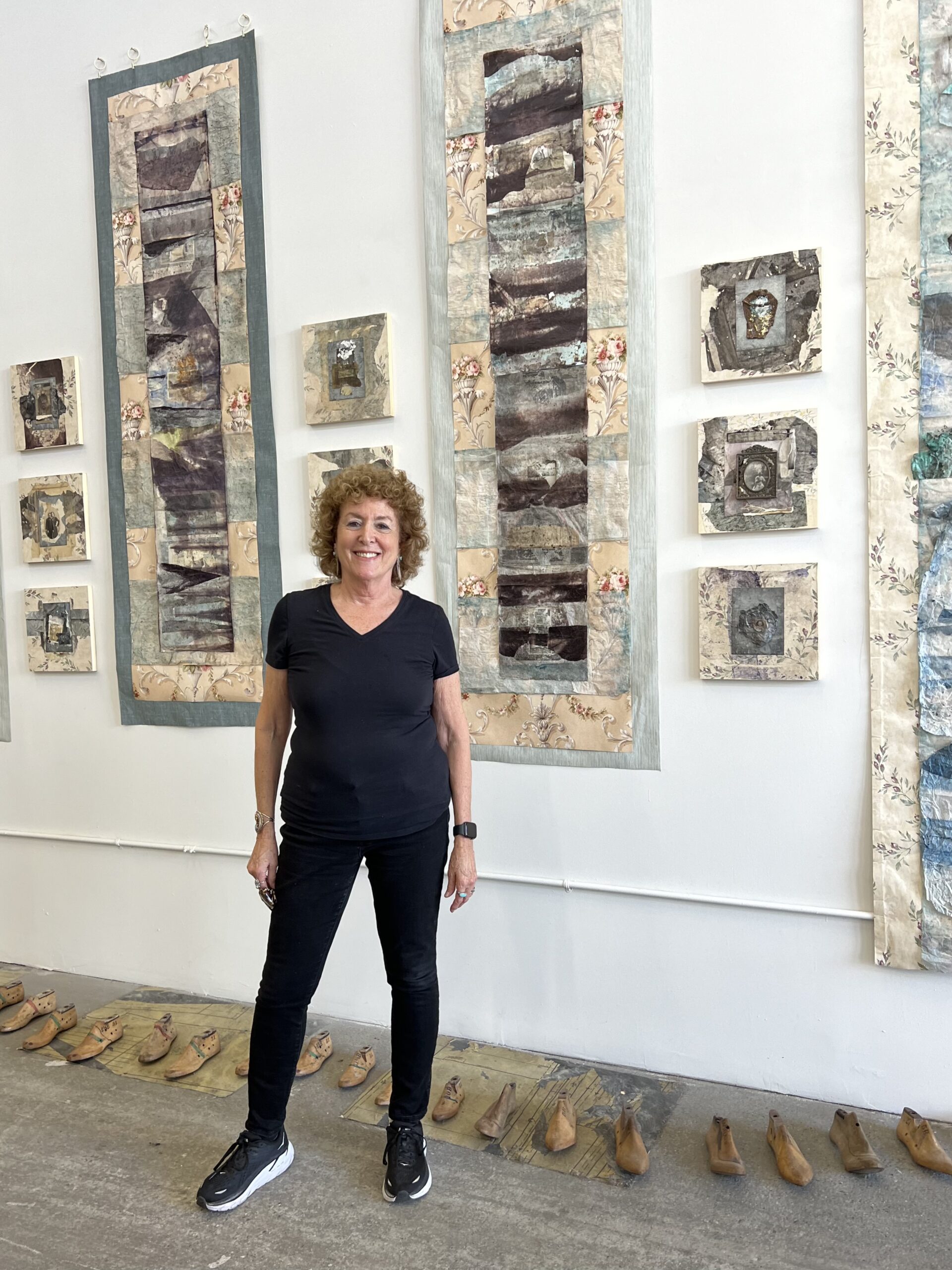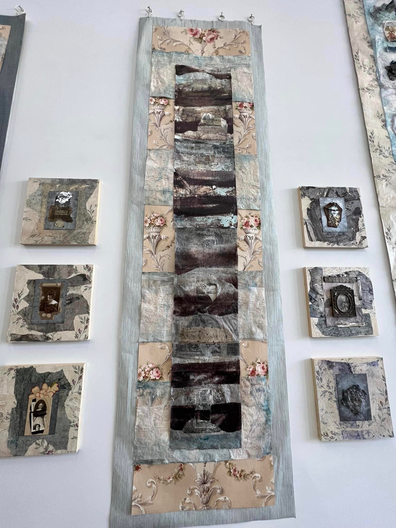 Next to her piece is a series of conjoined and delicate works from Nancy Kay Turner, “Lethe: River of Forgetting.” Despite the title, her mixed media on parchment scrolls are not only memorable but evoke the idea of memory, as does her “Ghosts and Unintended Consquences Series,” offering mixed media including found photographs on wood panel. At the base of both series, which form a primarily blue, white, and brown nexus on the center wall, is “Pilgrimage,” 28 vintage wooded shoe lasts which evoke the fallen or the forgotten. It is a haunting, massive series of works that fits together like pieces of the same, heart-rending puzzle.
