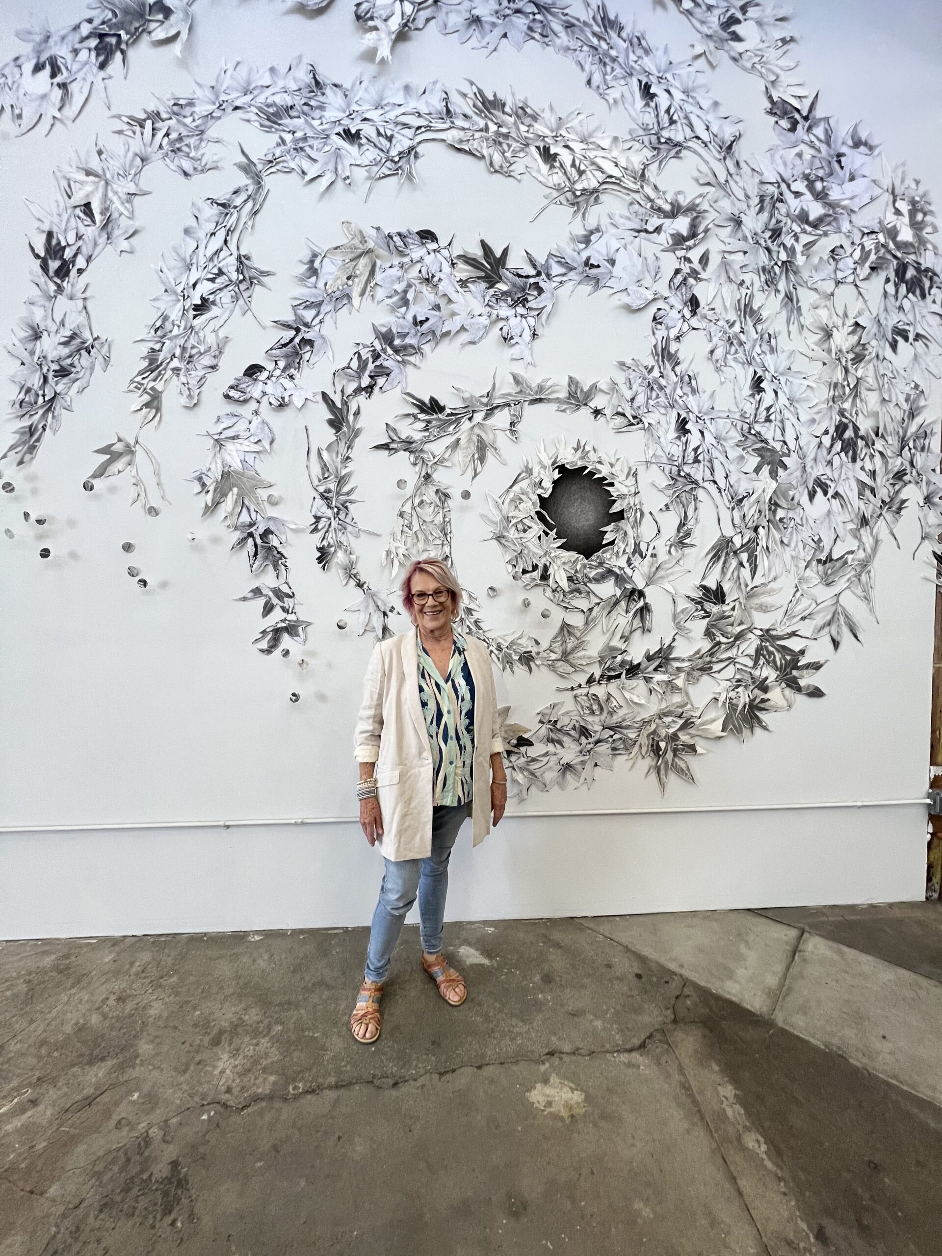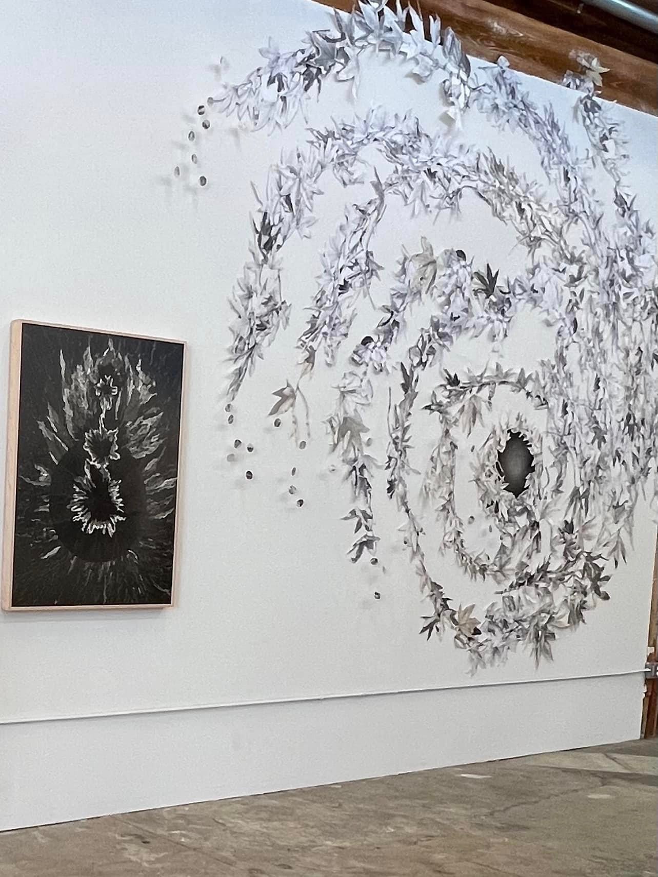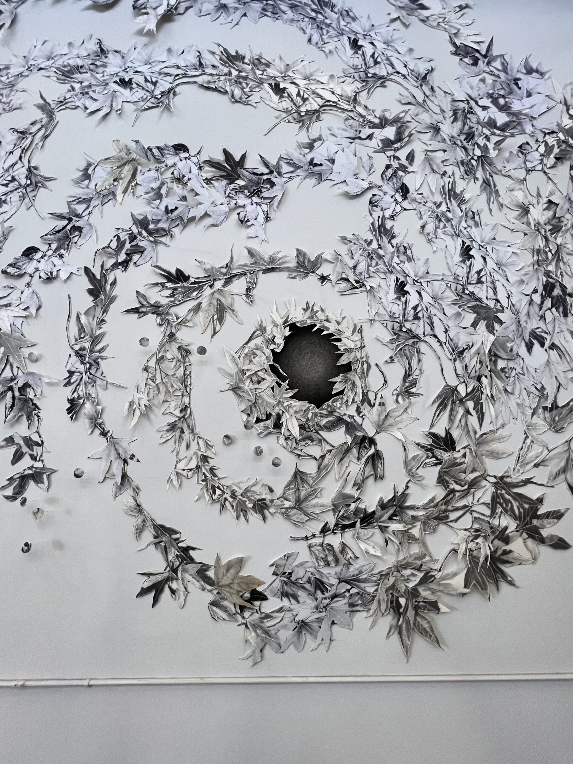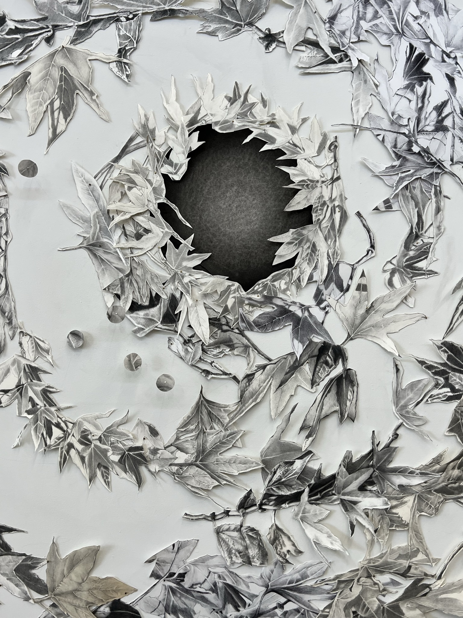 Rising just beside Yang’s work, and powerfully linked to Jenn’s in its swirl of leaves,is a virtuoso work from Catherine Ruane. Her vast “Vortex” encircles what appears to be the inside of a tree stump, or perhaps a magical black hole. Graphite, charcoal, white paint, and photo collage on rag paper make up this magnificent and vast profundity of delicately constructed black and white leaves. It is a tree in a snowstorm, a tree from Heaven, a cyclonic force as seen from above, embracing and encompassing. Here, Ruane’s work glows with the opalescence of her white paint, the delicacy of her leaves and her visceral accuracy of form, incandescent with a contained life force.