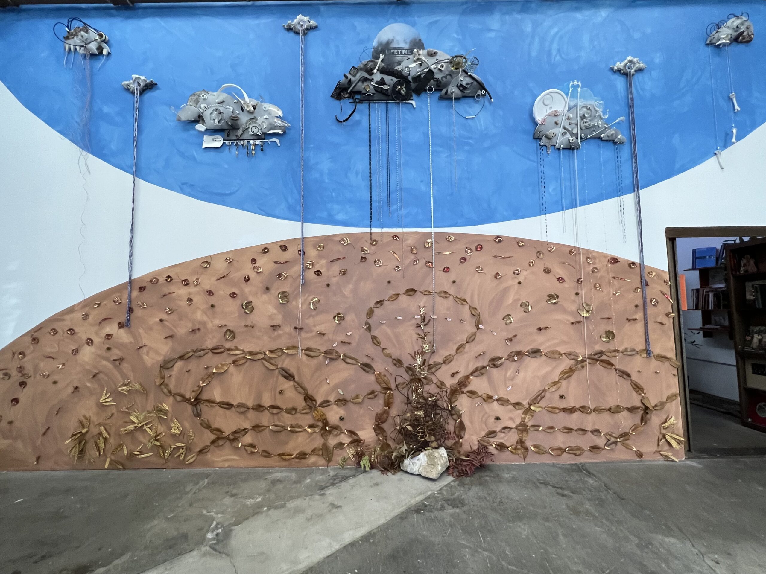 Adrienne DeVine’s mixed media installations and wire art mobiles sing of the earth, if the earth were given wings to spin. Her mobiles are accompanied by rocks and palm leaf sheaths – which speak to Bifulco’s work directly across the gallery. The largest piece is “Serenity in the Garden of Mother Earth and Father Time,” which is surrounded by her other works, including the magical motion of “Dance For Mother Earth.”