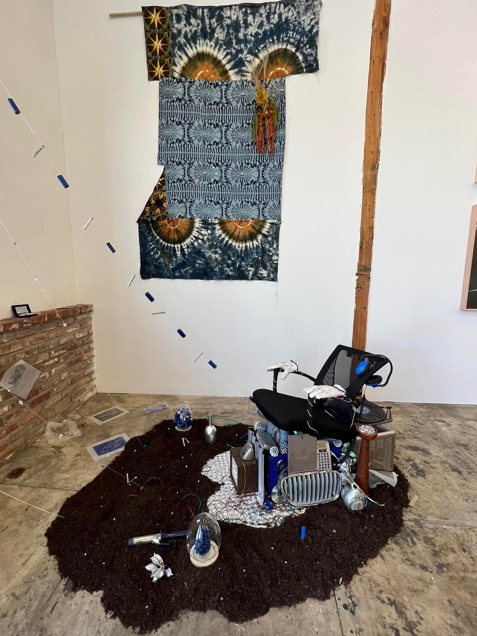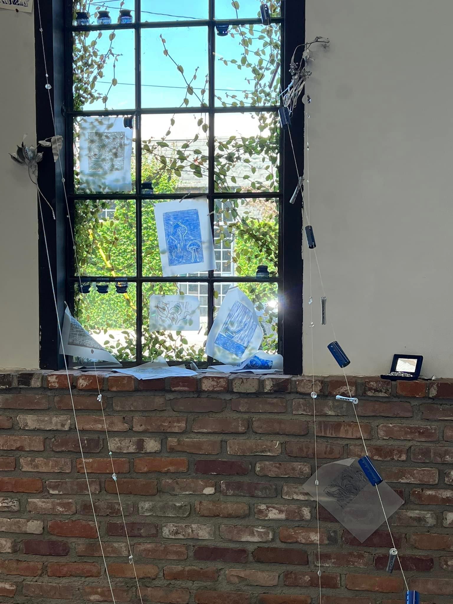 Acting as a kind of curatorial companion to Hollen’s spiritual building is the blue and gold work of Rosalyn Myles who offers both an astral map of fabric and dried flora, individual linocut prints, and a site-specific installation, “Stellar, “which seems to be a space pod ejected from the mother ship, replete with throw-back record player. It is squarely aimed outside the gallery, at a window to a street, and our present-day, pedestrian earth, a world which this viewer found it difficult to re-enter, after spending a wonderful afternoon taking in the celestial wonder of Where Earth Becomes Aether.