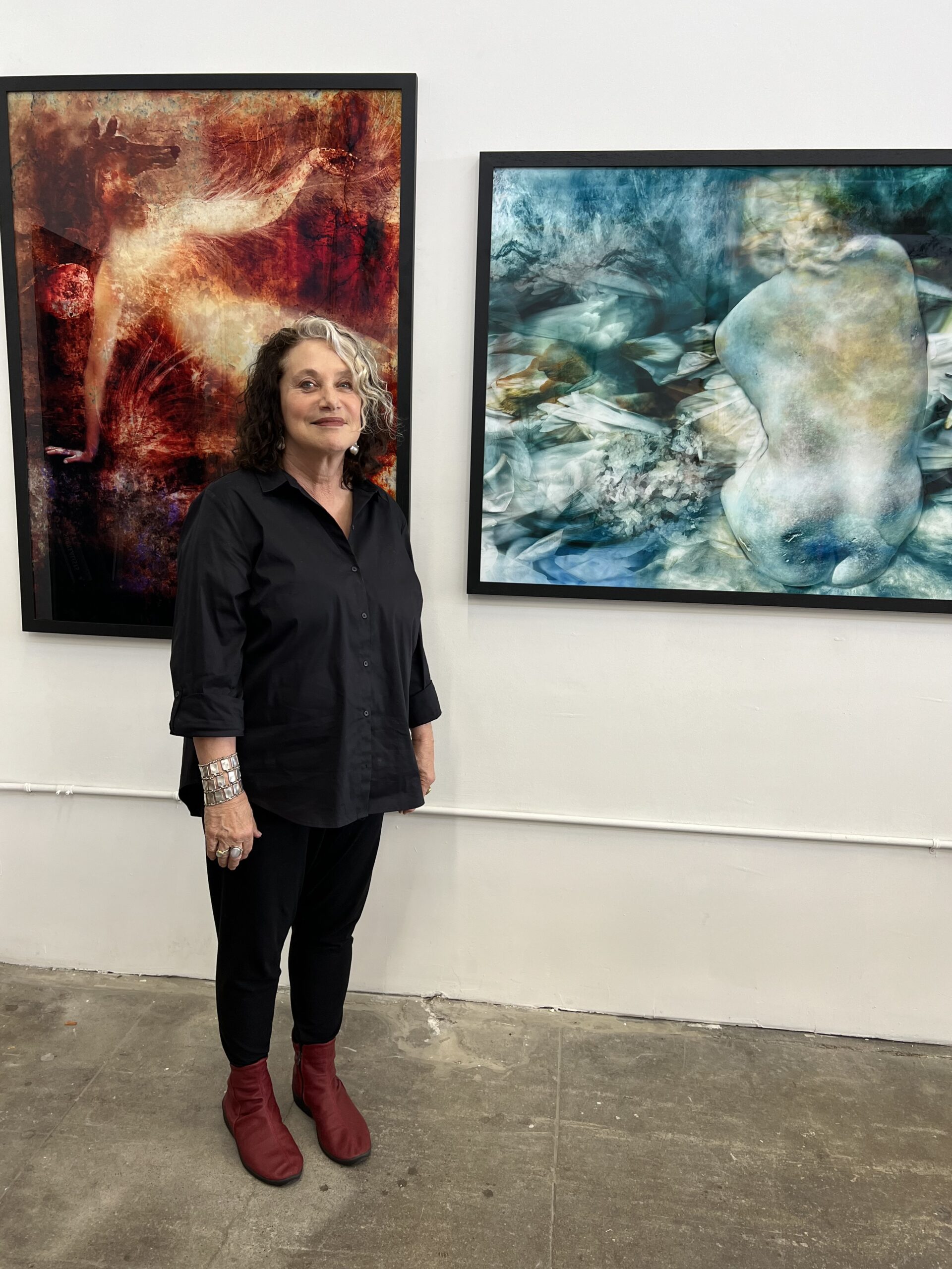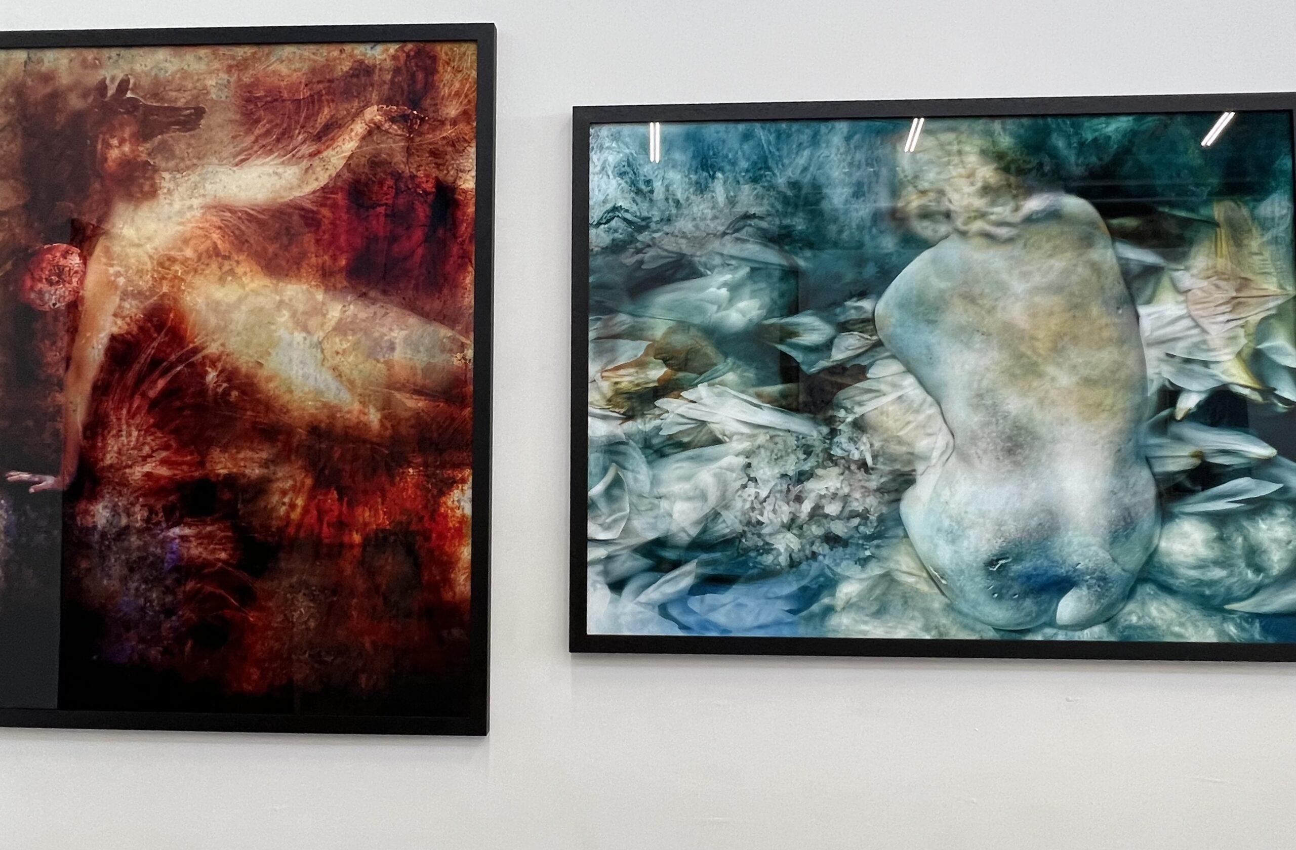 To the right of Jenn’s back-wall work, there are two delicate, ephemeral, fairy-like female figures rising within Aline Mare’s photographic works printed on glass. There is the luminous female form contained within the autumnal colors of “Anubis Head,” and the meltingly green and white fecundity of “Butter.” These beautiful works are as soul-soothing as they are slightly witchy, a heady brew.