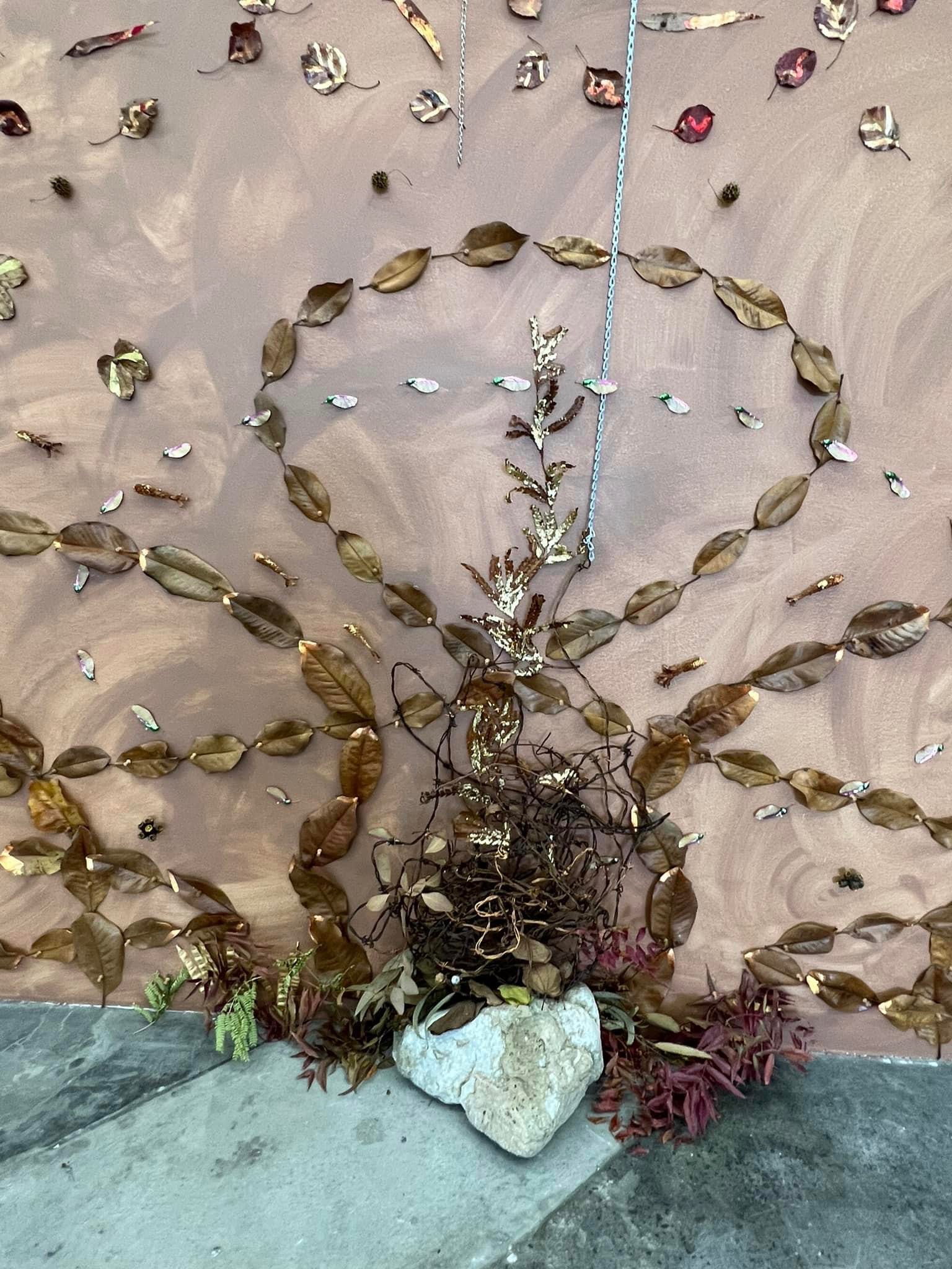 The viewer’s eye is immediately drawn to the backwall of the gallery, whose height is often overpowering in other exhibitions. Here, it’s fully utilized by co-curator Jason Jenn. Mixed media and acrylic paint are the materials used for “Interconnected: the Sky Serenades, the Earth Dances,” a site-specific installation available for re-creation. Blue above and brown below, the serendipitous combination reveals both sky and ground, with elements that include a swirl of gilded metallic leaves, bones, and rock.