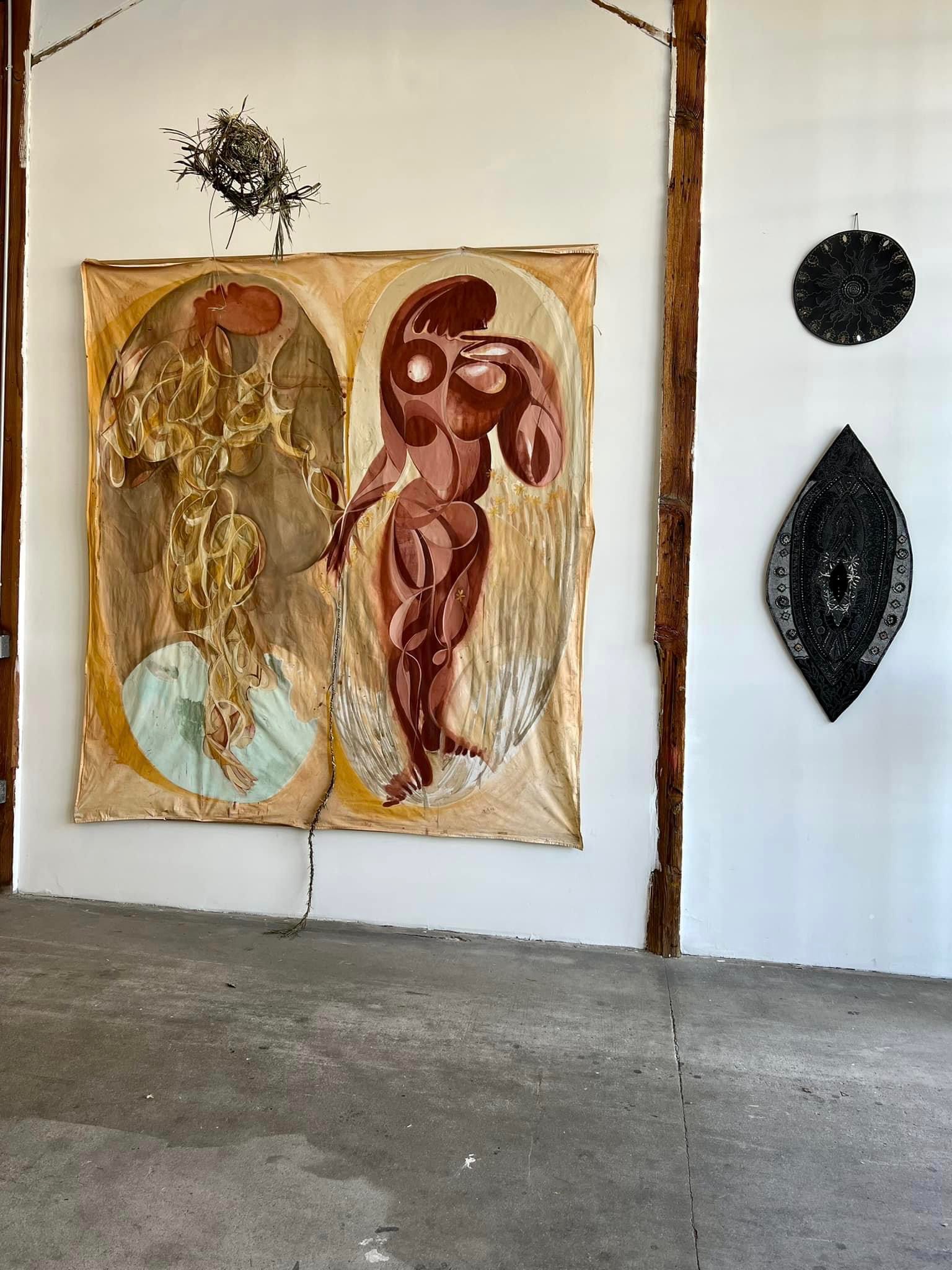 Cheyann Washington’s “Conjunction” creates the appearance of human figures arisen from the earth or sky. Using natural mineral pigments on oak-mounted fabric and an extension rope of woven dried plant material, she seems to be shaping her own Adam and Eve with sweeping, strange, grace.