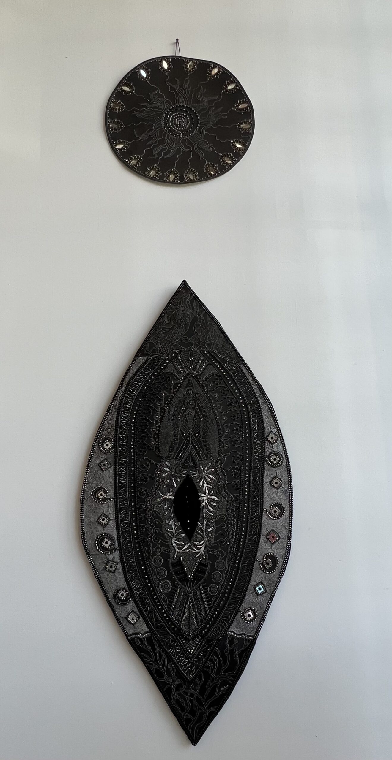 Working in delicate perfection, Marthe Aponte shapes a sphere and a shield that seem like the perfect potential defense for Washington’s figures. Using picote, paper, mirrors, beads, and velvet, her two works here, both “Reflexion/Reflection (Sphere)” and “Shield as Spatial Dialectics, ” also recall and celebrate the vaginal nature of birth, both physical and spiritual .