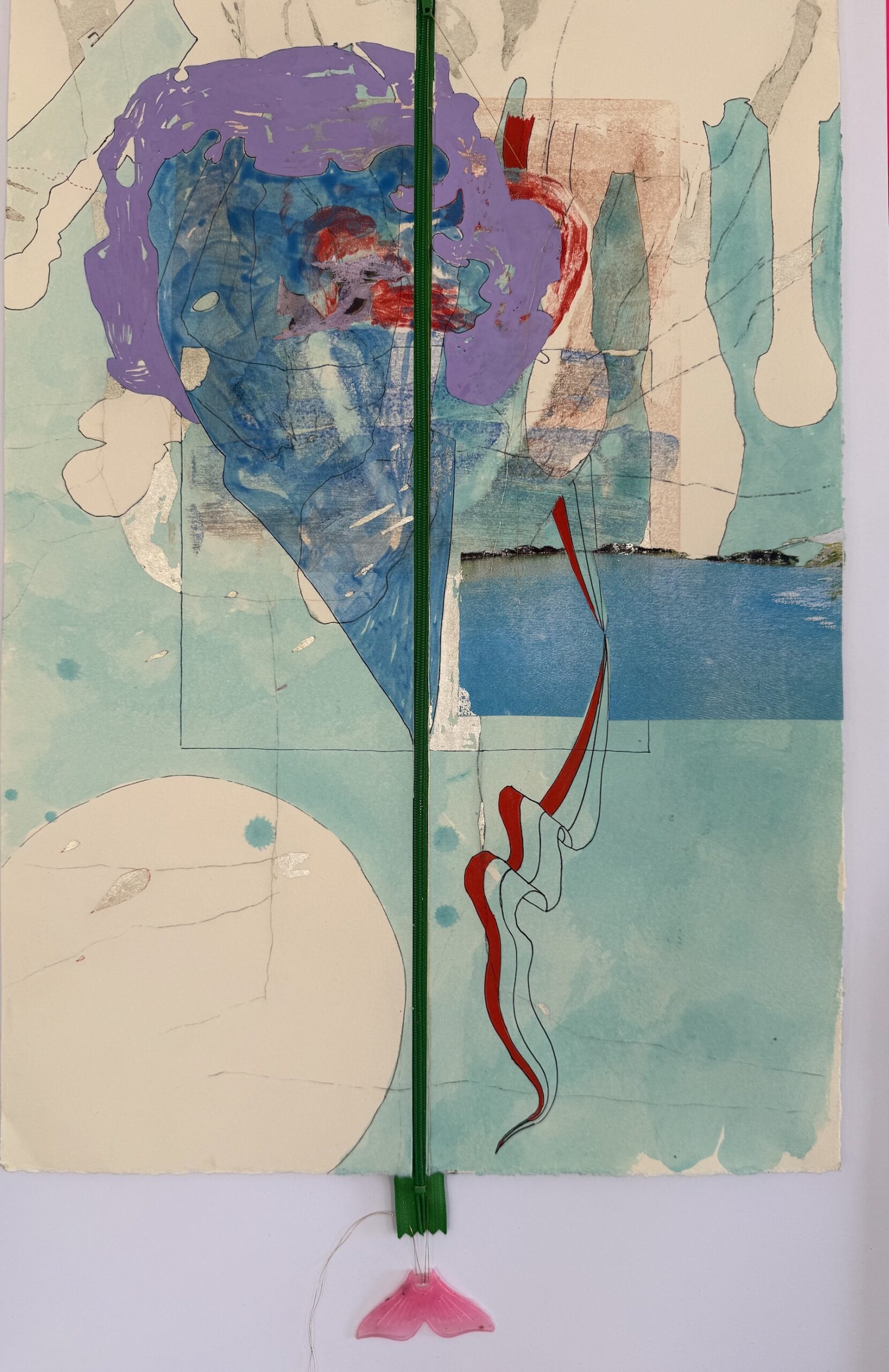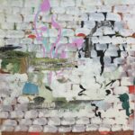 Amy Thornberry builds layered compositions based on collaged images overlaid by paint. Her gestural brushstrokes obscure the images, like the levels of earth and detritus that cover archaeological ruins. Viewers must visually “dig” through the upper levels to find the historic remains below. The Dissolution of Fragility is based on Sir John Everett Millais’ 1851-52 painting Ophelia (the tragic Shakespearean heroine). The reclining figure seems to appear then disappear, ghostlike, under cloudy white veils. Thornberry’s composition succeeds if simply appreciated for its formal pleasures (color, texture, etc.), and the female figure gives it a certain “magical” depth. A more readily perceptible image is the translucent crouching woman, whose head is silhouetted against two poppy-red “clouds.” The rewards of Thornberry’s oeuvre are found in the visual investigation of her veils of color and form. The painted collages are never just what they initially appear to be; there are always rich levels of meaning, rich varieties of signifying artistic clues.