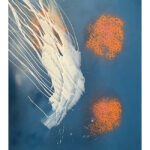 Sharon Weiner’s paintings are totally abstract. She pours paint mixed with liquid acrylic over large canvases or smaller pieces of paper to create glorious images that can allude to cosmic flow. In Night Sky (2025), a dynamic white cloud, with a deep blue underside, zooms into midnight depth. Other works have biomorphic references: in Cluster (2025), purple arteries are entangled with luminous blue and yellow cells. Yet others are oceanic: In State of Grace (2025), a wave crashes on the beach, spreading its aqueous offerings. To be surrounded by Weiner’s work is to be invited to lift and expand emotionally (or dare I say spiritually?)—which is precisely what these abstract shapes are doing. The images are inspiring and her painting titles are poetic: State of Grace, Spirit, Celestial Passage, Soar, Transform. In this age of trauma, contention, and violence, it is tremendous to see a creator speaking to our highest aspirations, rather than our lesser selves. Weiner’s paintings are, like the art of all three of these truly talented and accomplished women, radiant gifts.