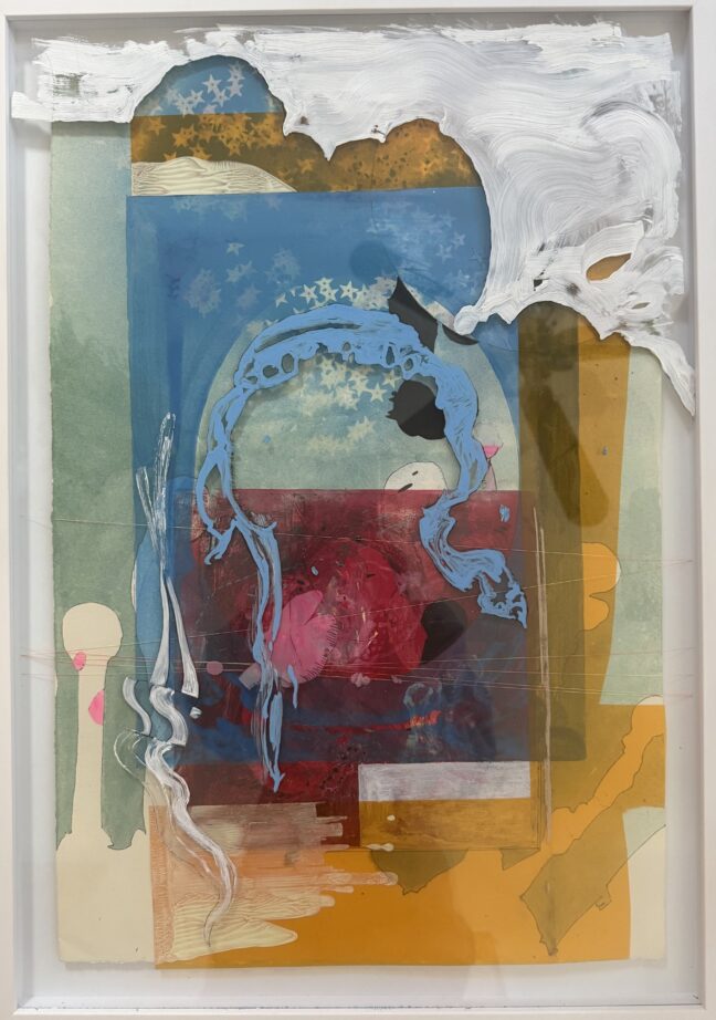 Genie Davis has expertly curated an exhibition that features three extraordinary artists: Connie Saddlemire, Amy Thornberry, and Sharon Weiner. All three deal with expressive abstraction, to one degree or another. They do so in diverse media, from Saddlemire’s photography-based printmaking to Thornberry’s painted collage to Weiner’s acrylic on canvas.